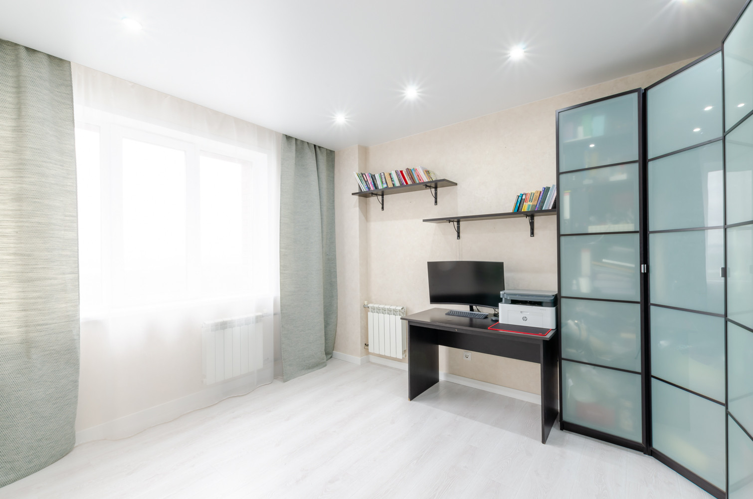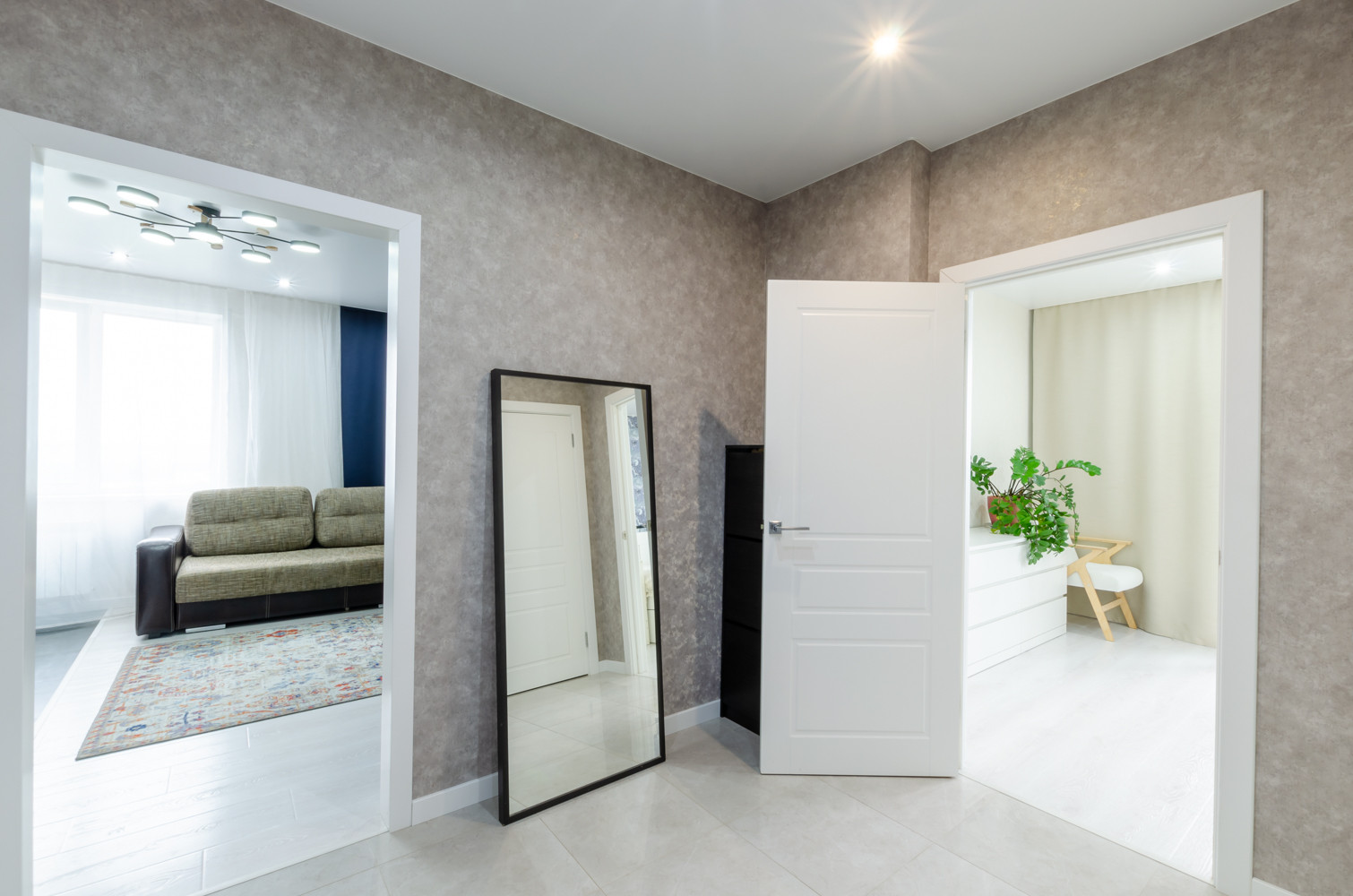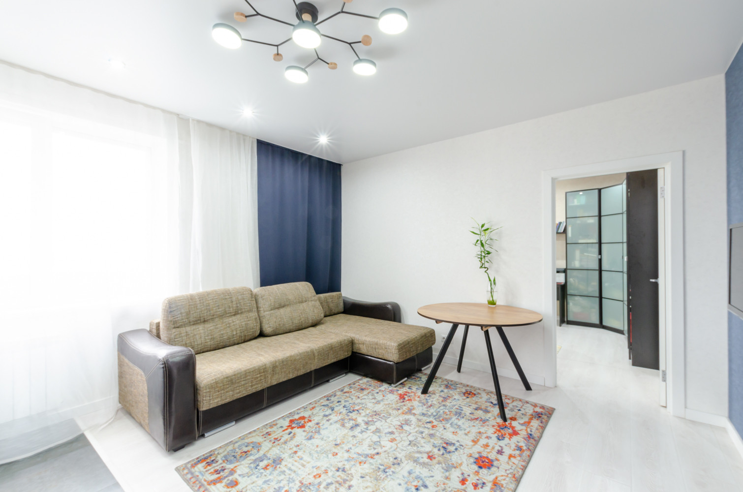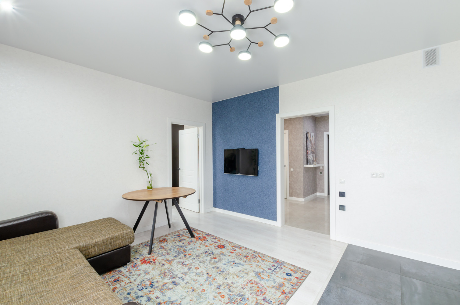 На полу: ламинат, керамогранит. В санузле, коридоре и кухне-гостиной теплый пол.