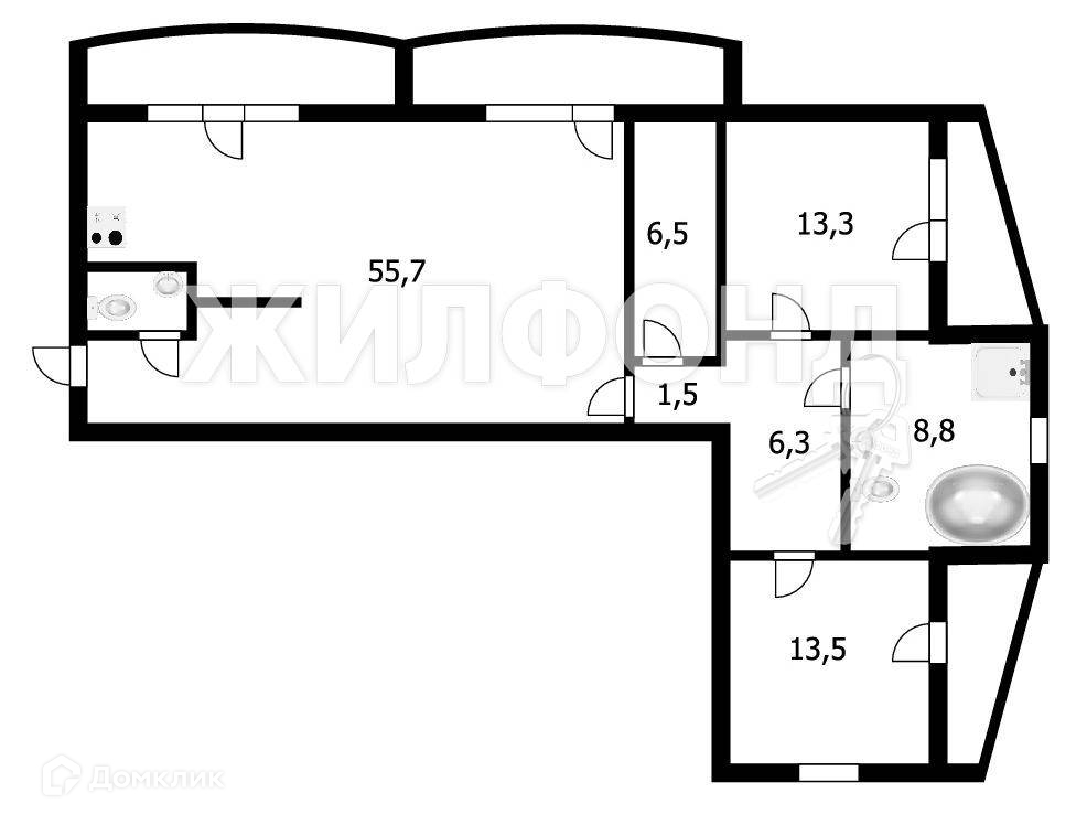 Кухня-гостинная 55,7 кв.м., две спальни по 13,5 кв.м., 2 с.у, 4 лоджии, предусмотрена гардеробная комната.