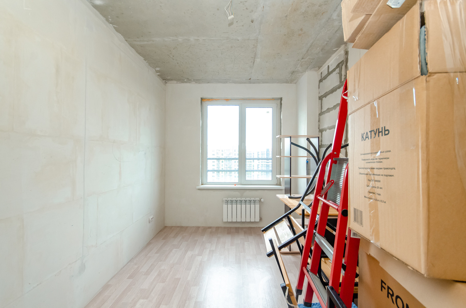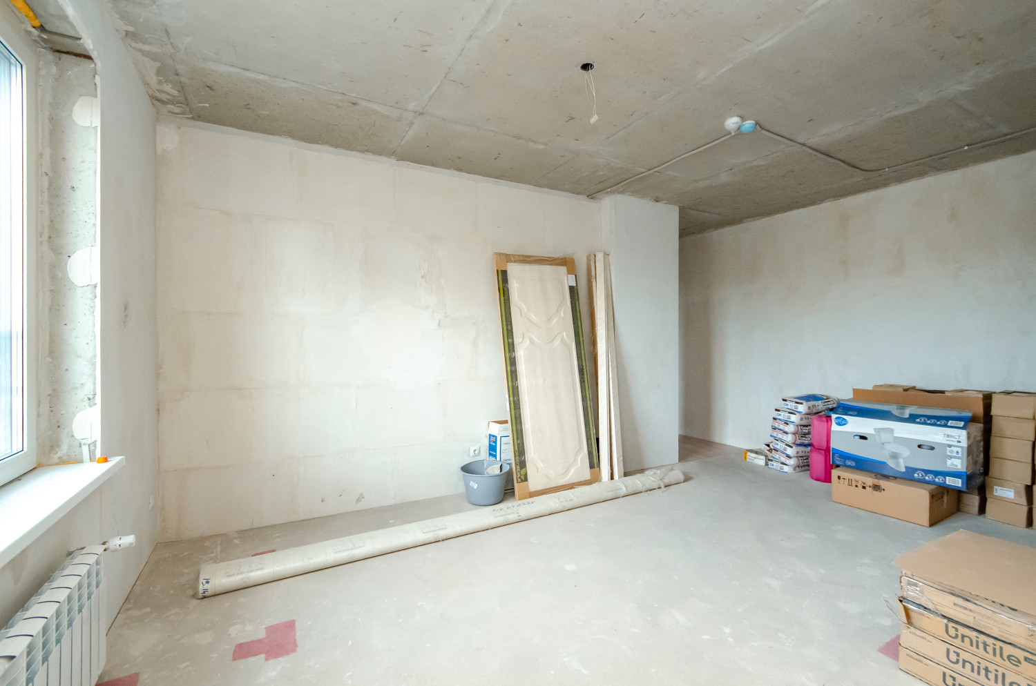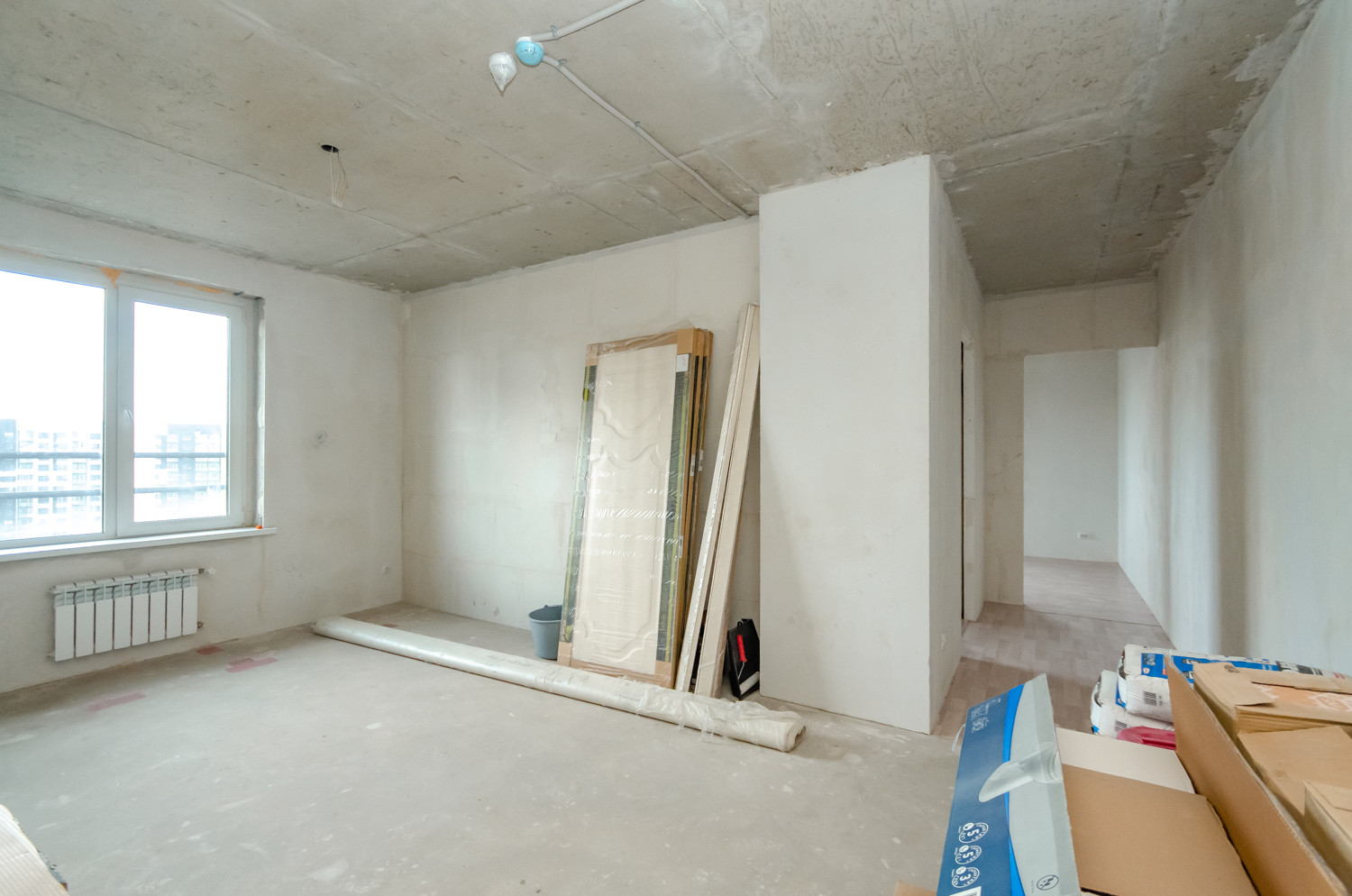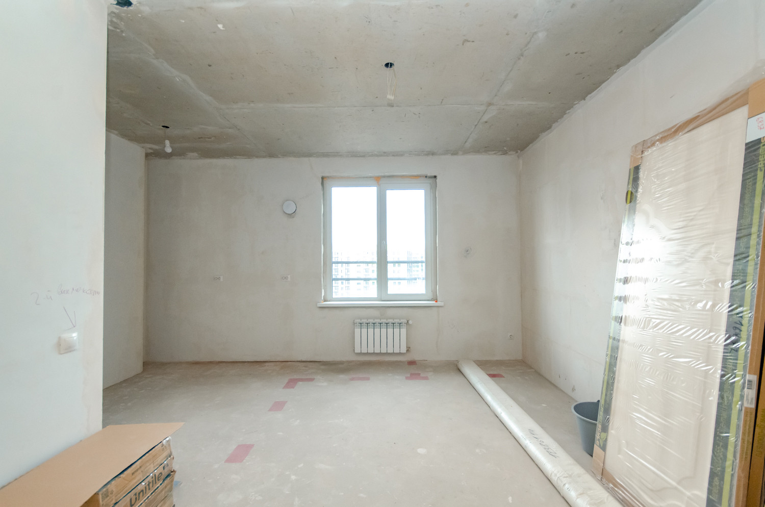 Квартира расположена на видовом 15 этаже. В подарок будущему покупателю остаются строительные материалы, на фото они видны.