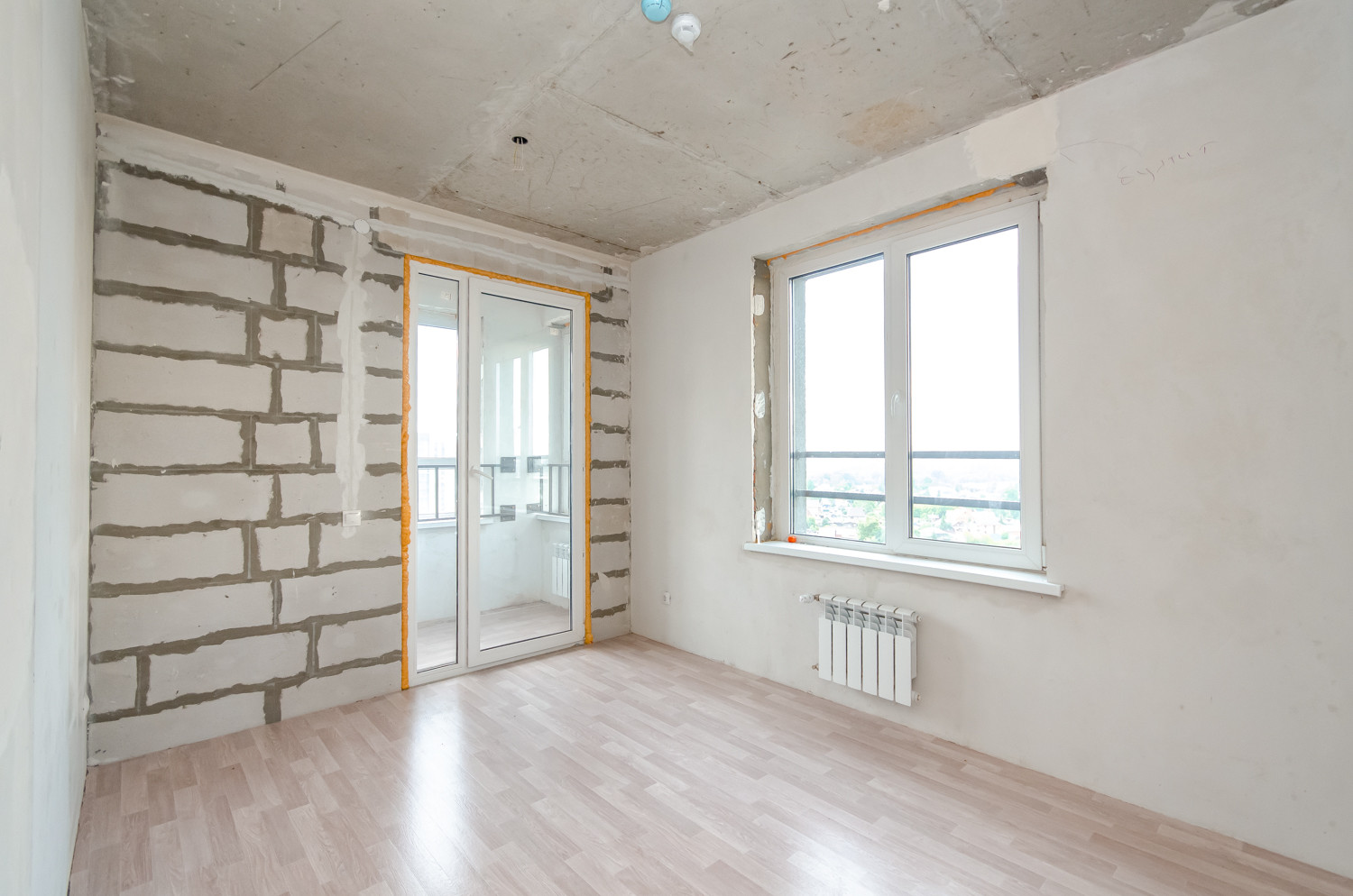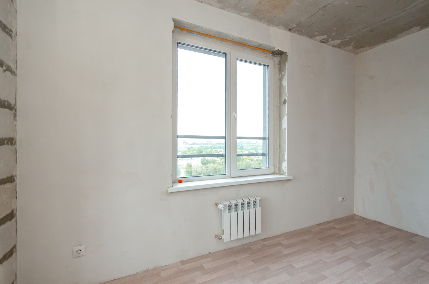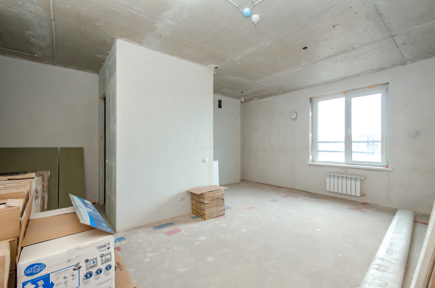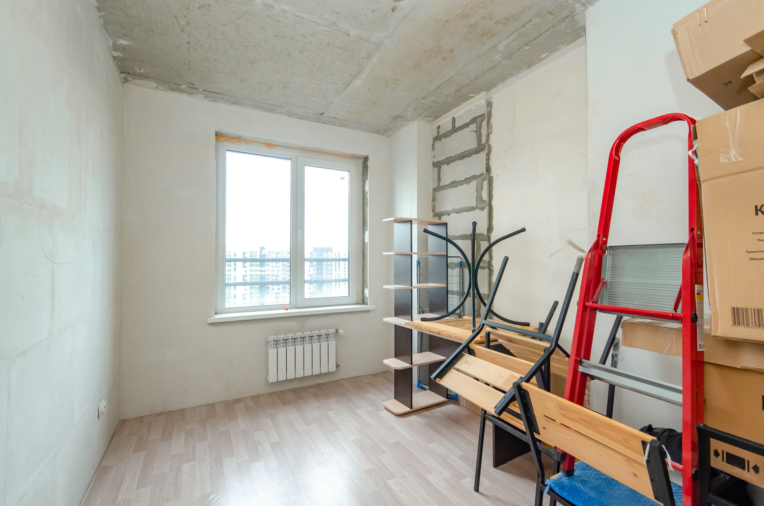 Квартира расположена на видовом 15 этаже. В подарок будущему покупателю остаются строительные материалы, на фото они видны.