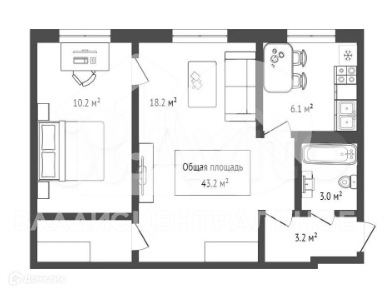 Общая площадь 43.2 м2