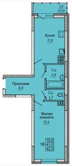 Общая площадь : 42.3 кв.м./ без лоджии 41.30 кв.м