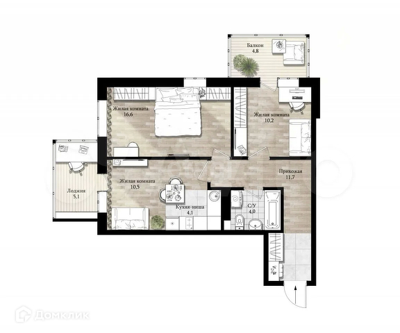 Полноценная двухкомнатная квартира с кухней-гостинной, в ЖК «Никольский парк».