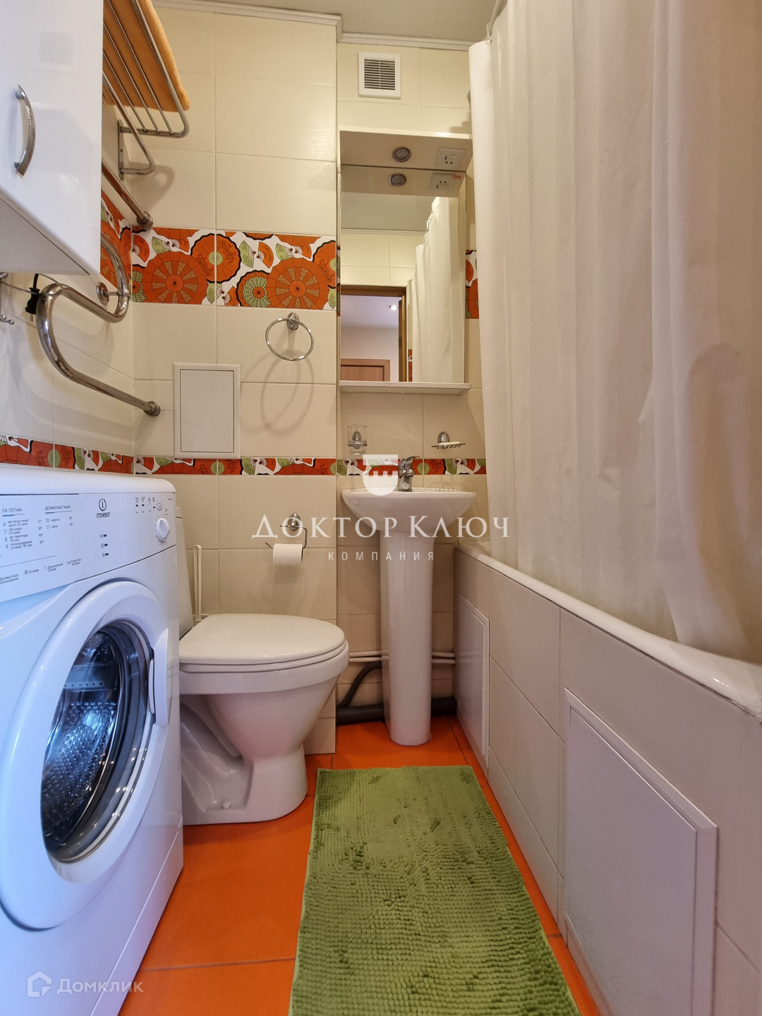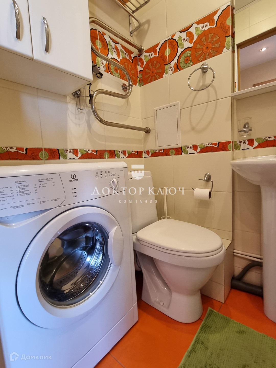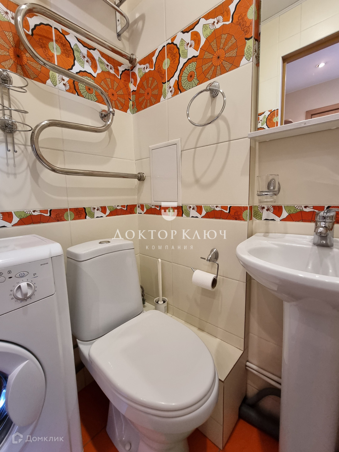 Санузел совмещенный: чугунная ванна, унитаз, раковина, стиральная машина, водный полотенцесушитель