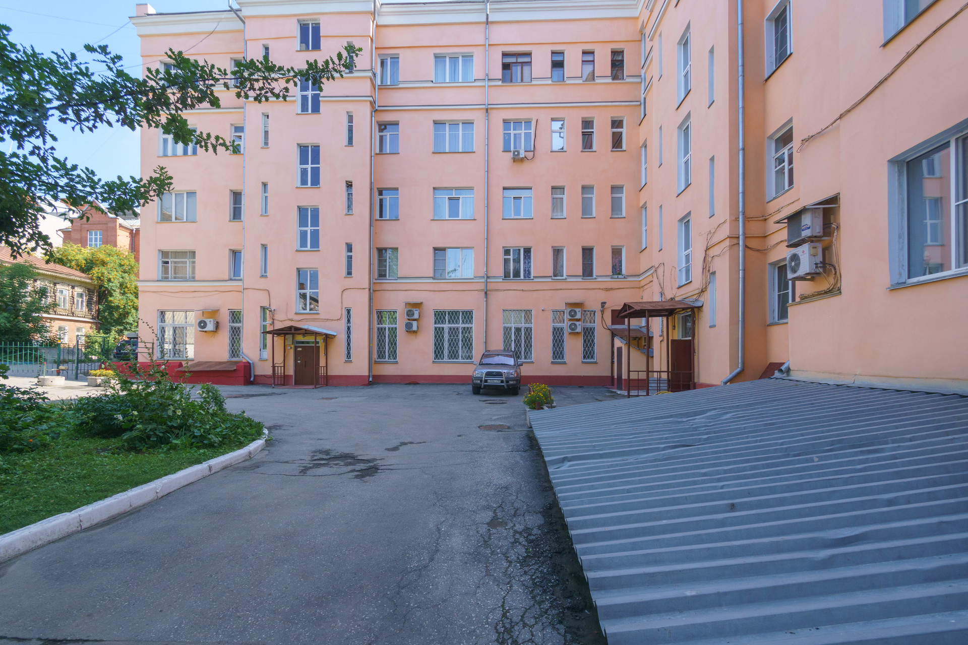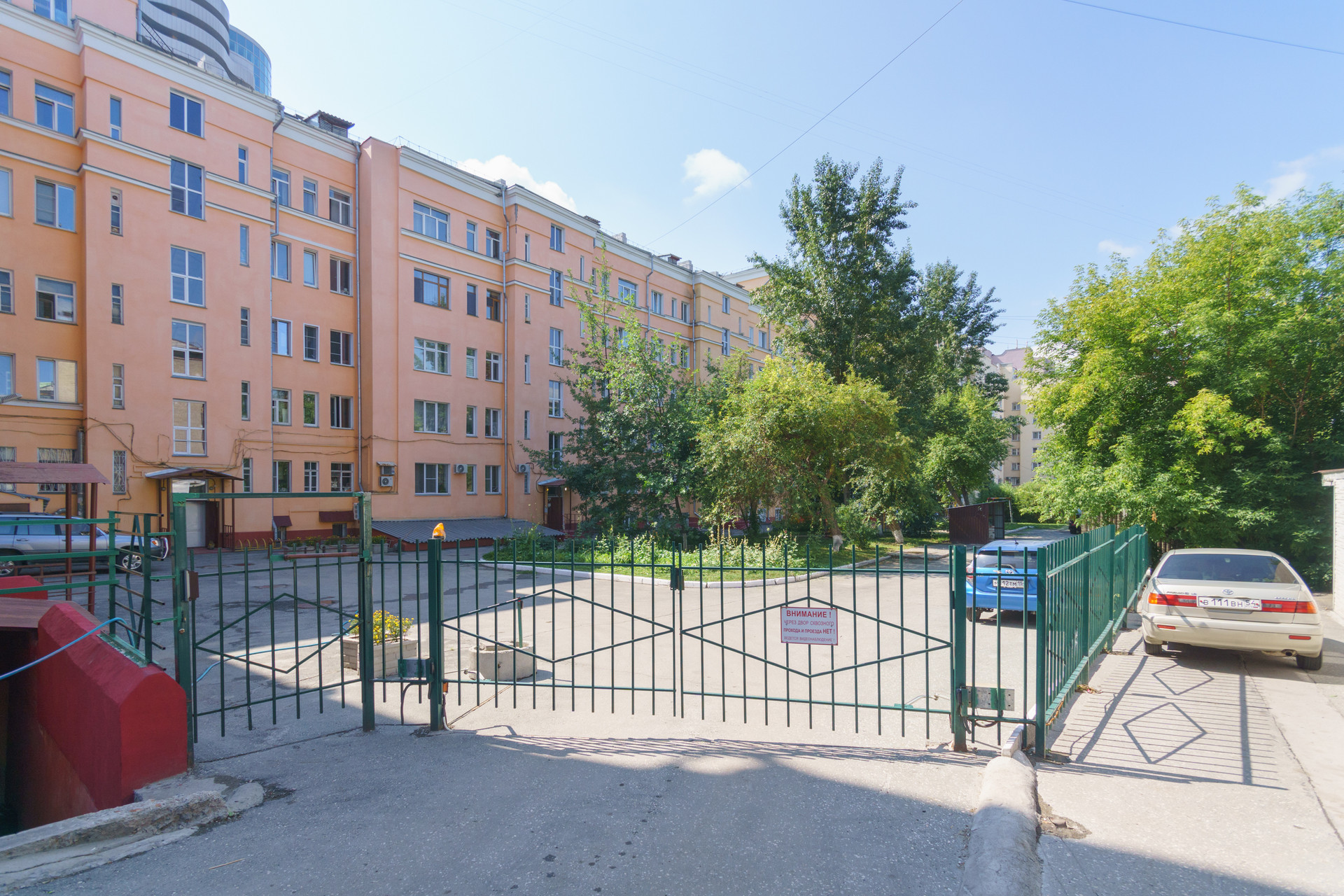 6) Территория дома огорожена, установлен шлагбаум. Парковочных мест достаточно.