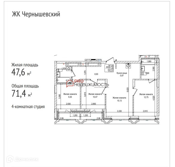 4-к. Студия, 71.4 м2