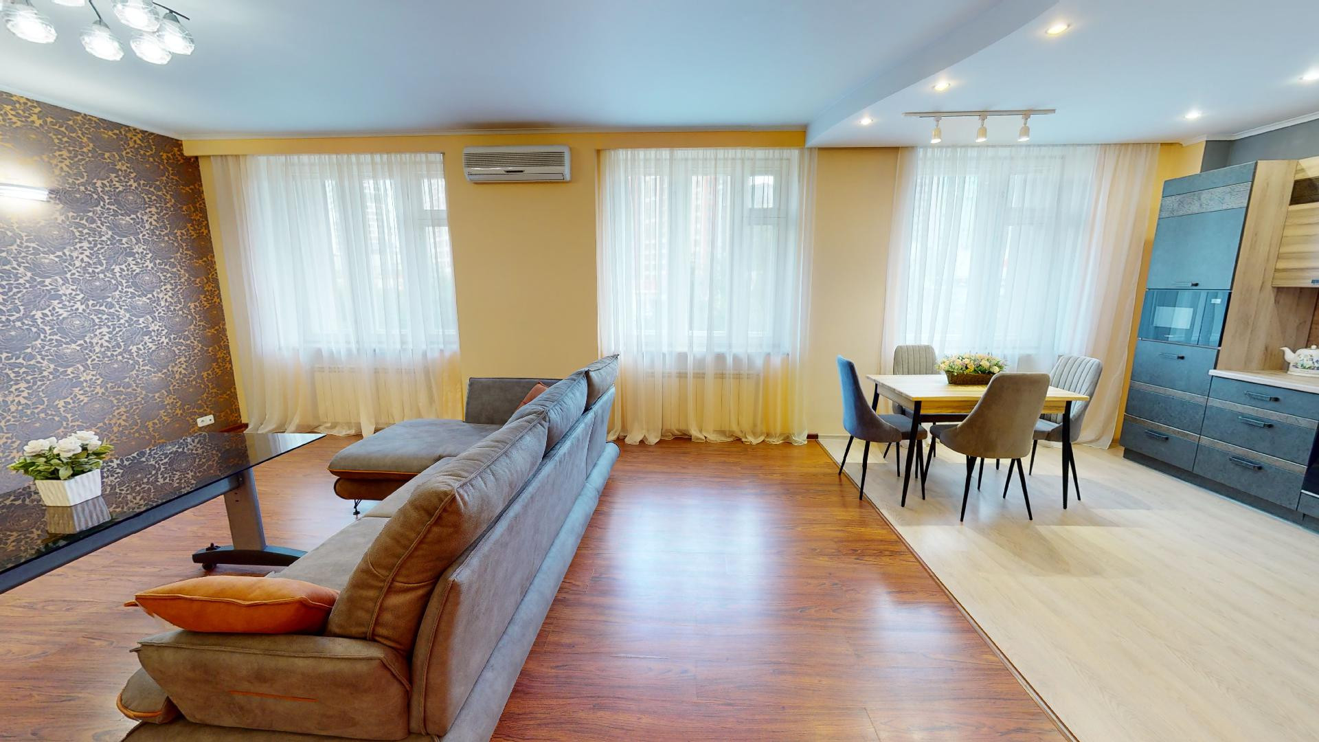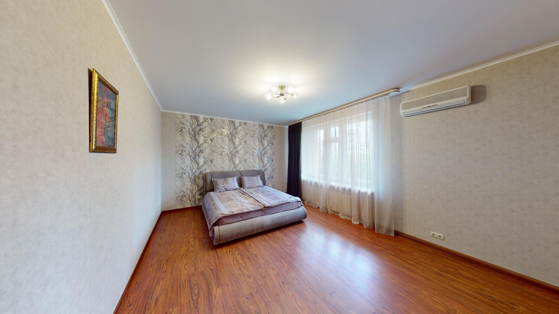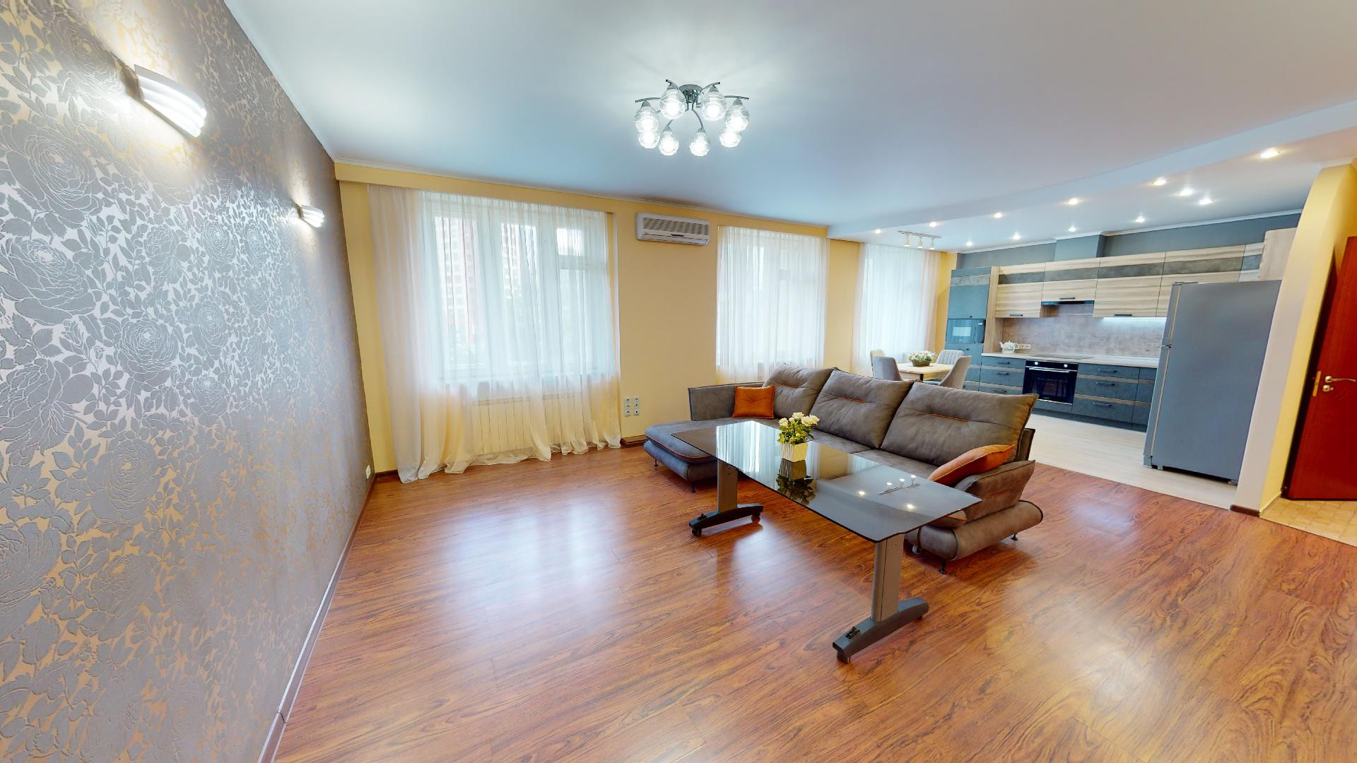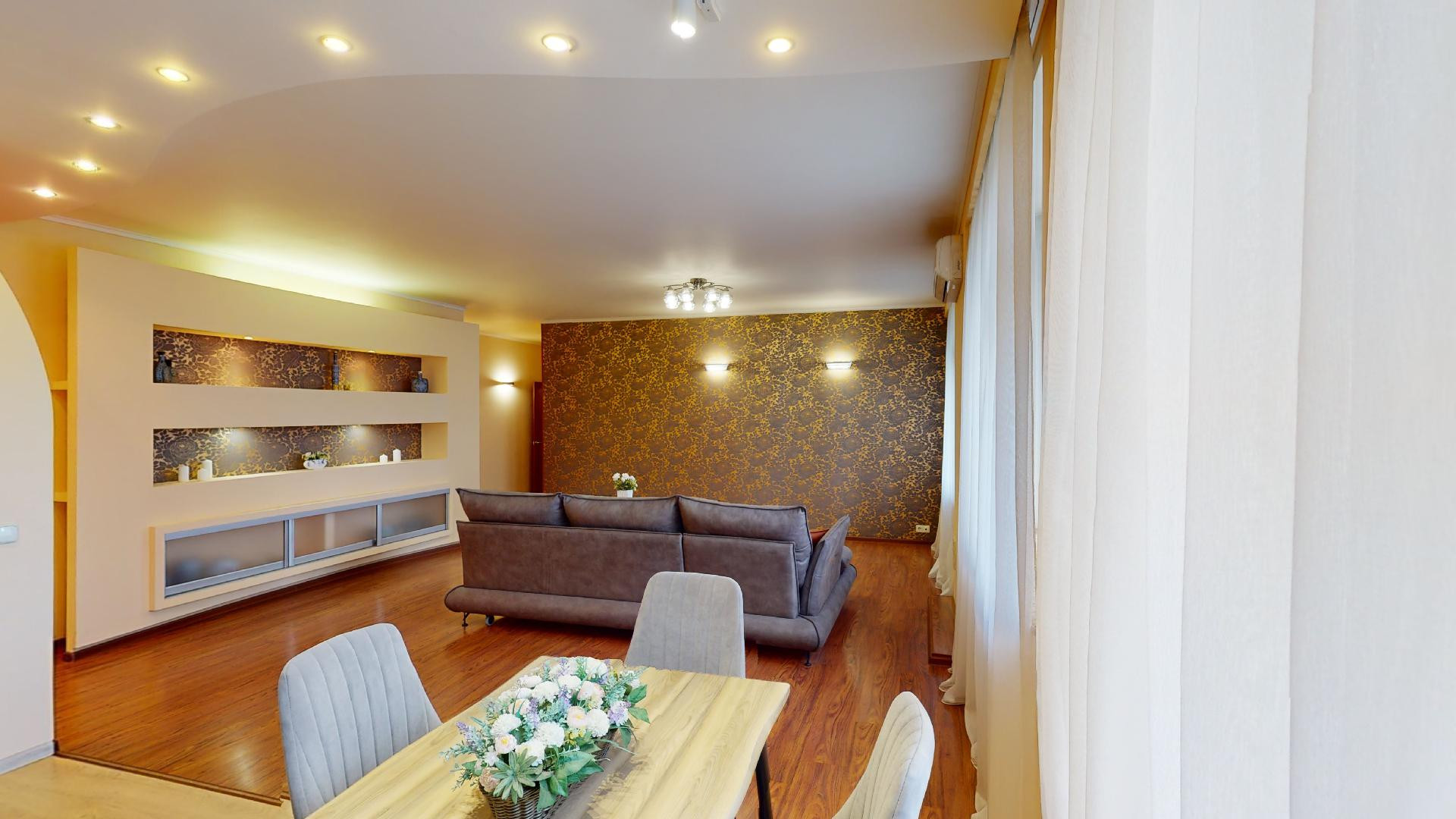 Сделан качественный ремонт, после которого еще никто там не жил. Благородные нейтральные тона, обои под покраску, местами – панно из итальянских обоев, много стильных элементов декора с полочками. На полу – ламинат, в холле и санузлах – керамогранит. Высокие потолки, разноуровневое освещение. В комнатах – кондиционеры.