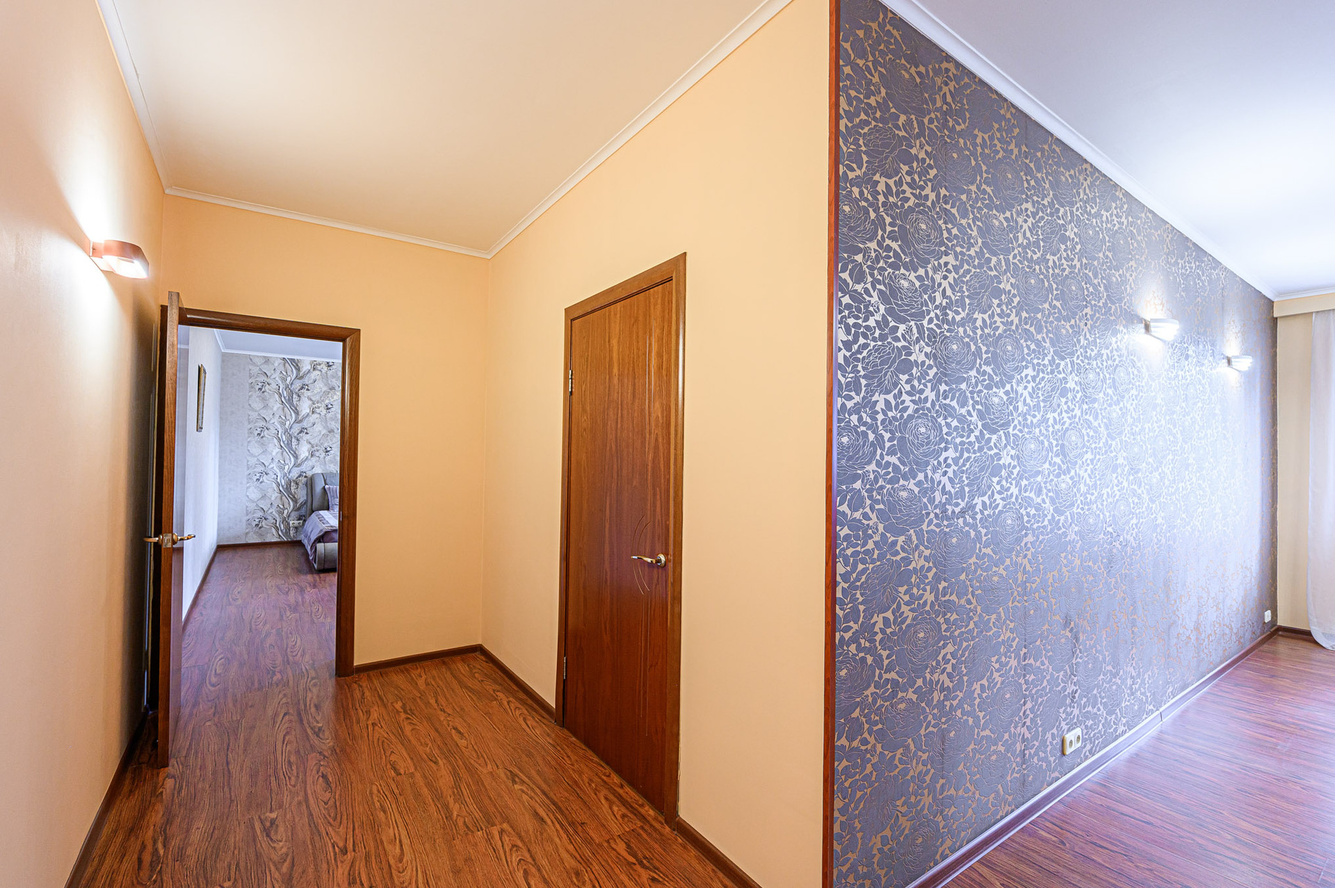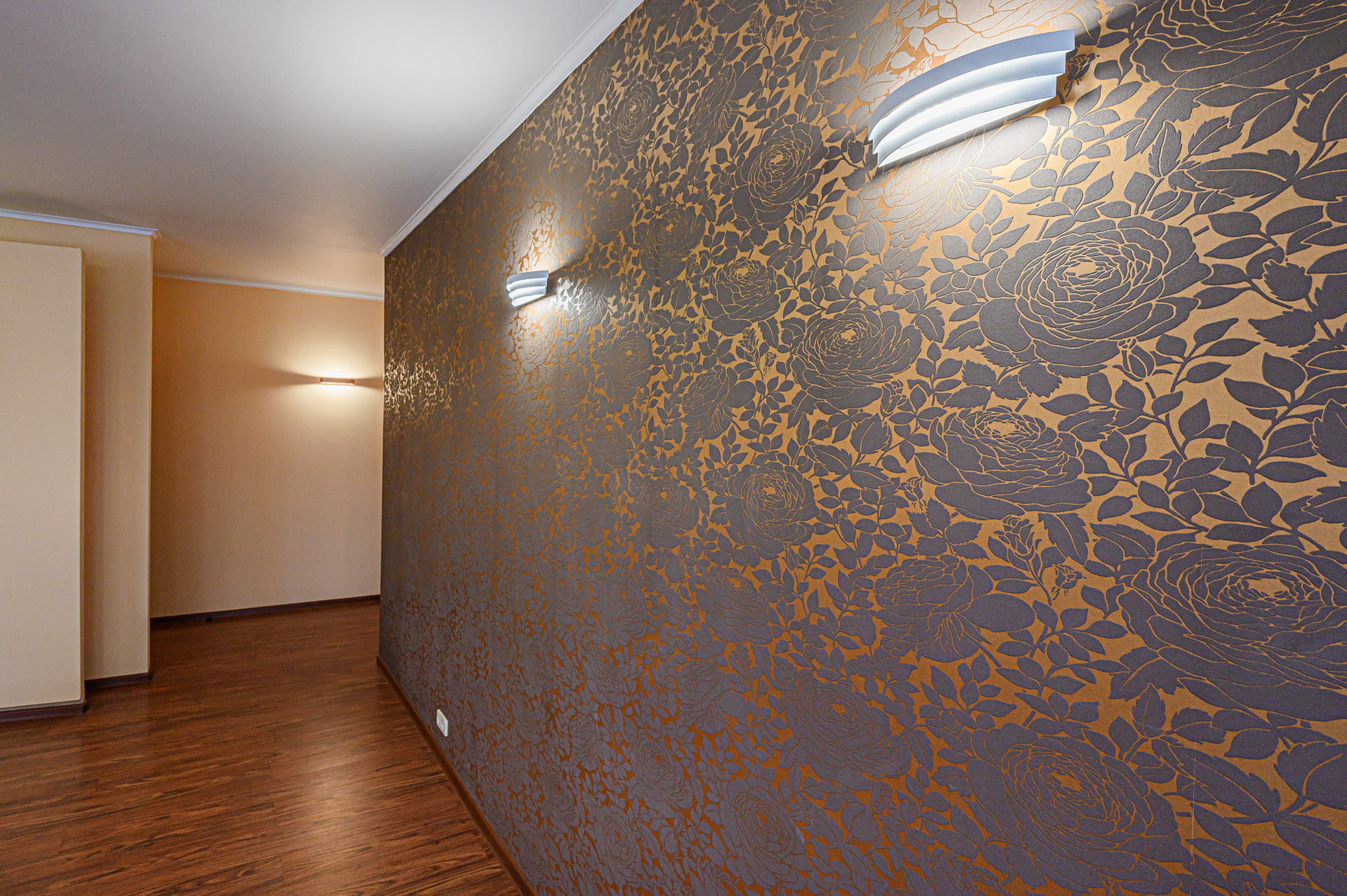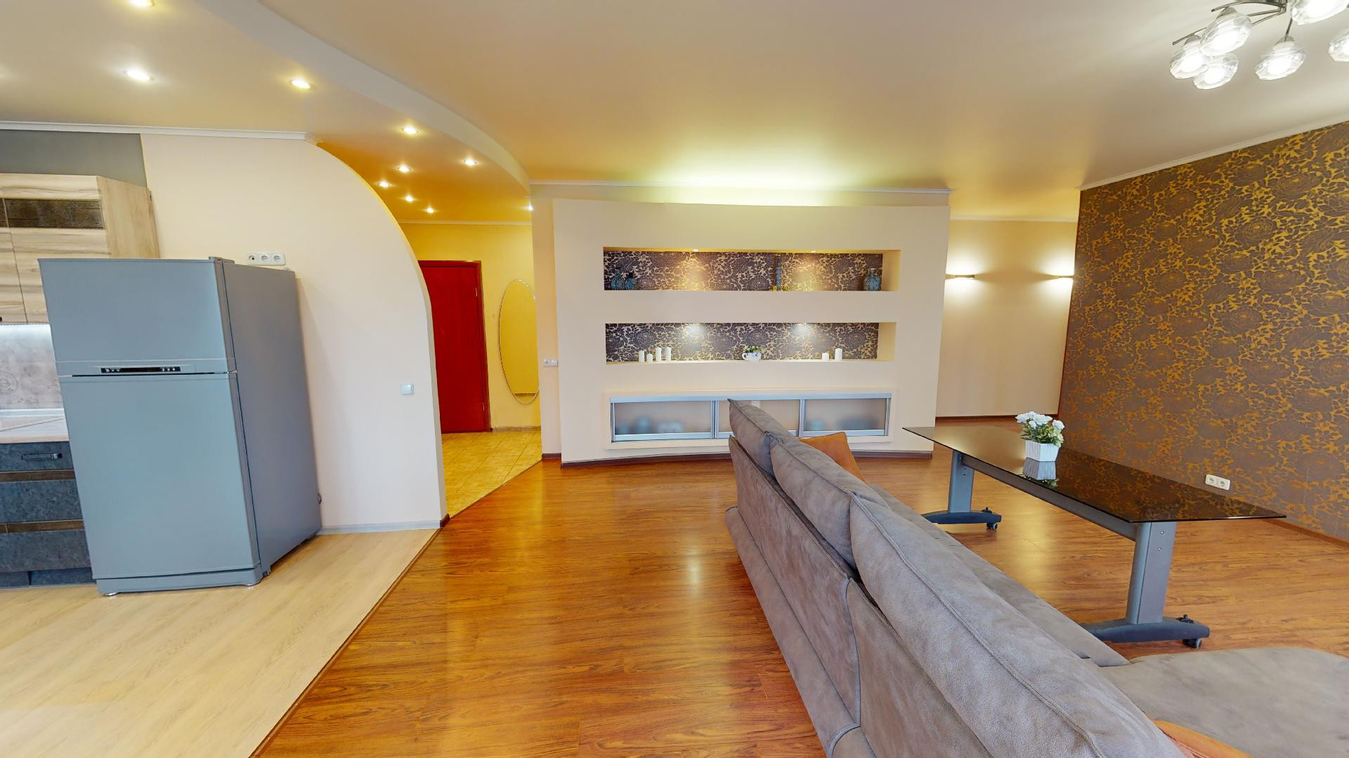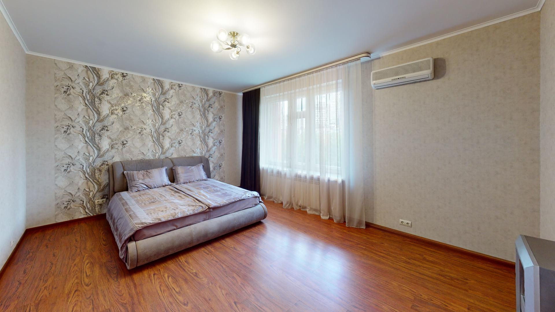 Сделан качественный ремонт, после которого еще никто там не жил. Благородные нейтральные тона, обои под покраску, местами – панно из итальянских обоев, много стильных элементов декора с полочками. На полу – ламинат, в холле и санузлах – керамогранит. Высокие потолки, разноуровневое освещение. В комнатах – кондиционеры.