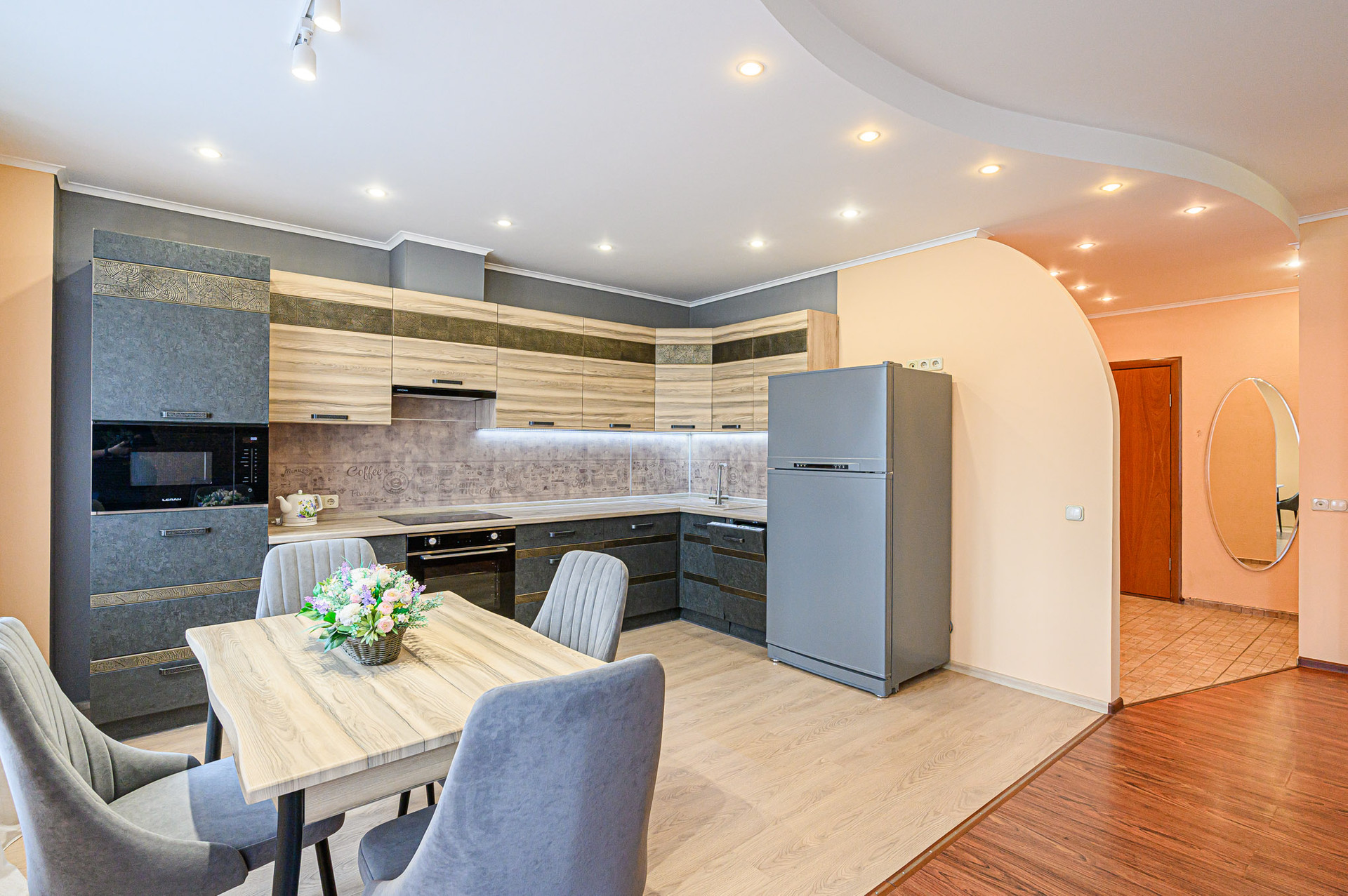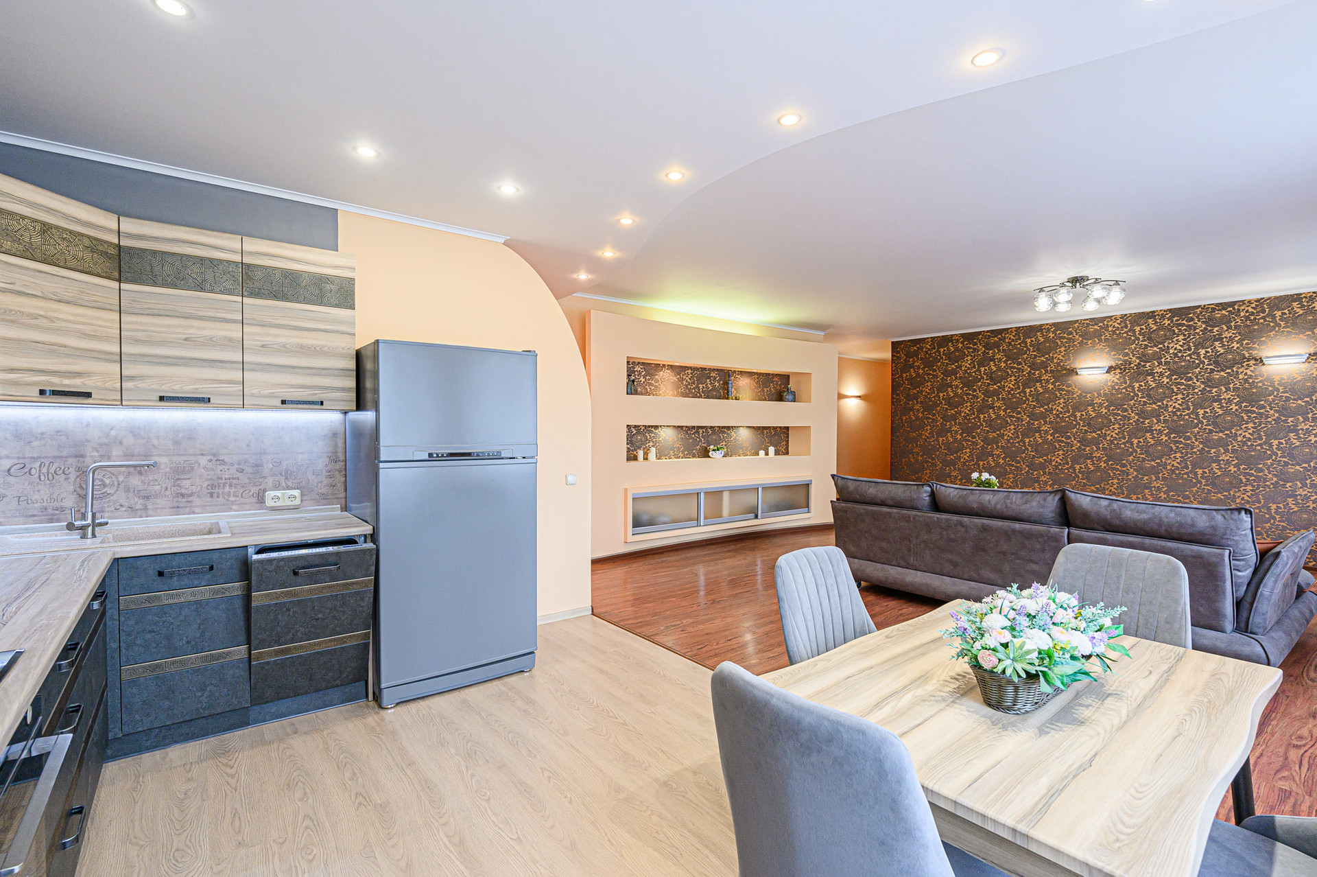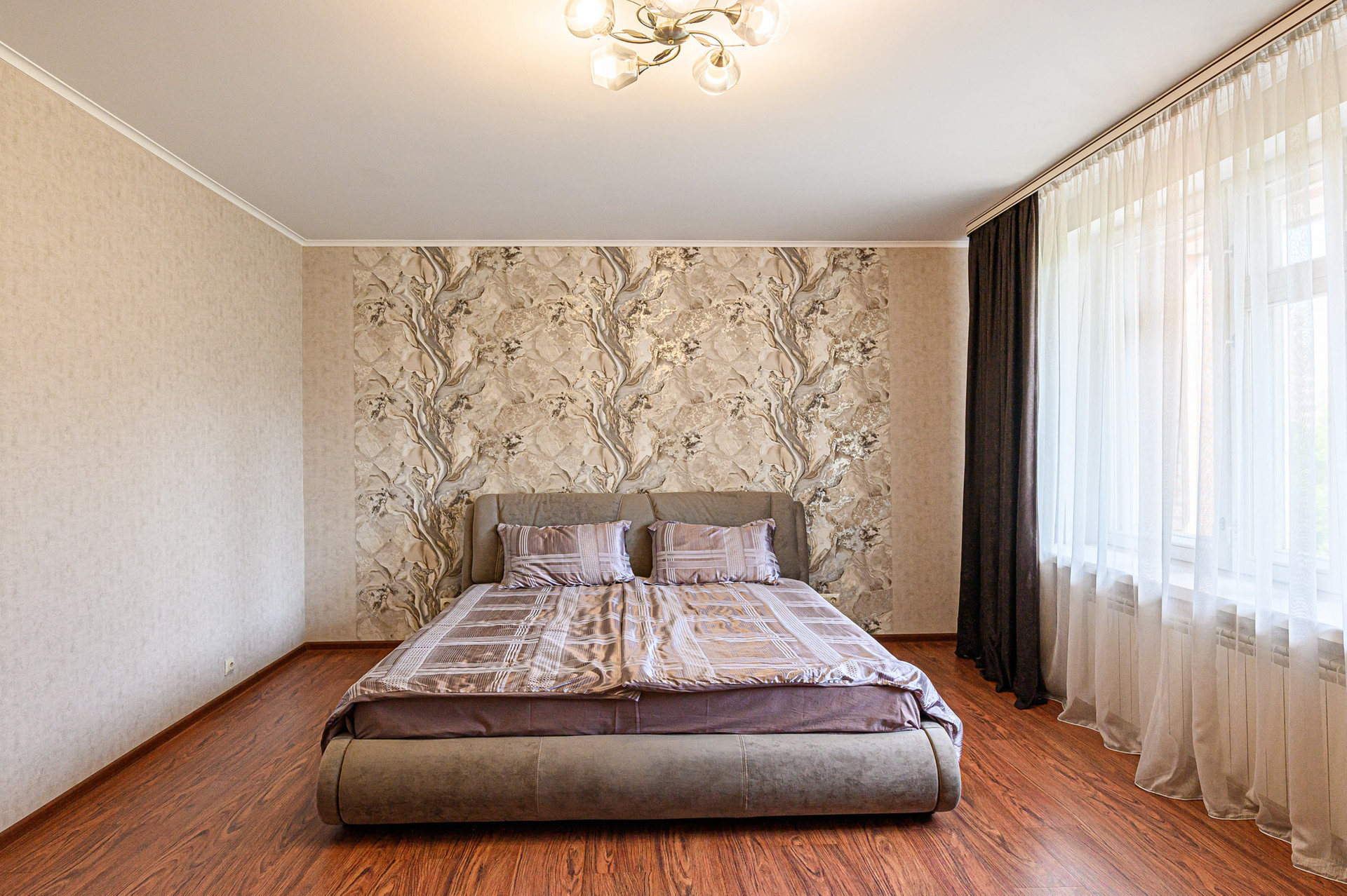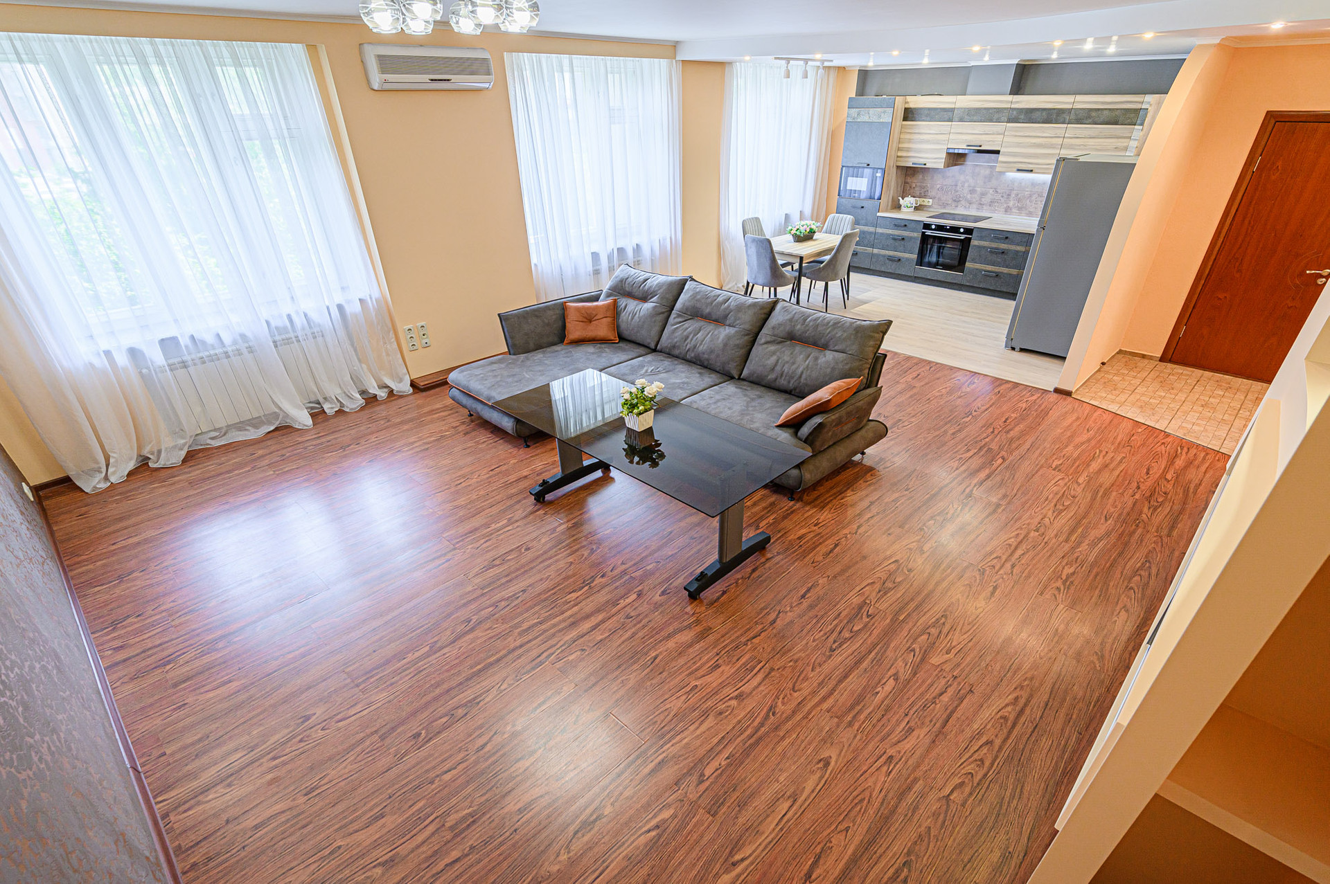 Сделан качественный ремонт, после которого еще никто там не жил. Благородные нейтральные тона, обои под покраску, местами – панно из итальянских обоев, много стильных элементов декора с полочками. На полу – ламинат, в холле и санузлах – керамогранит. Высокие потолки, разноуровневое освещение. В комнатах – кондиционеры.
