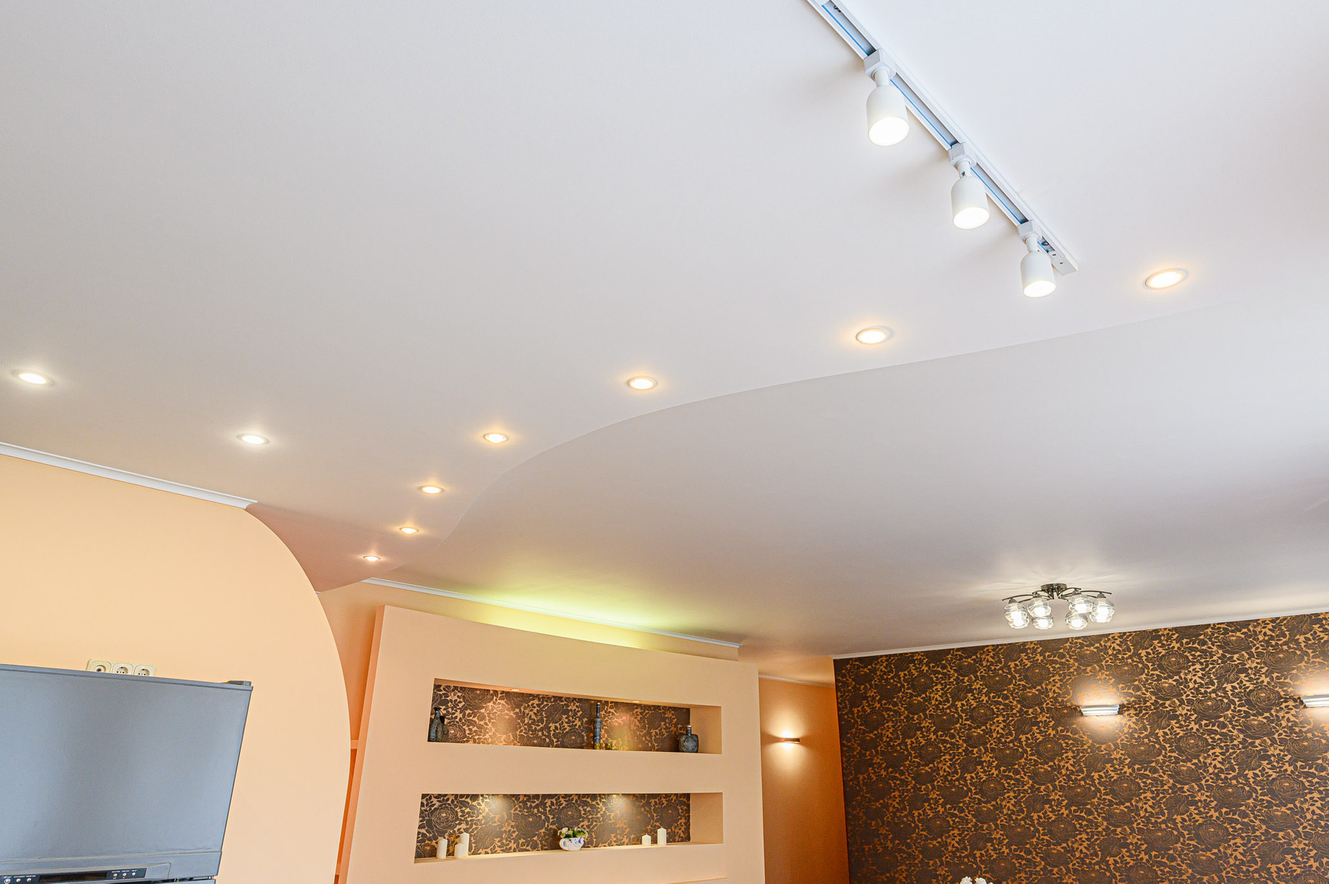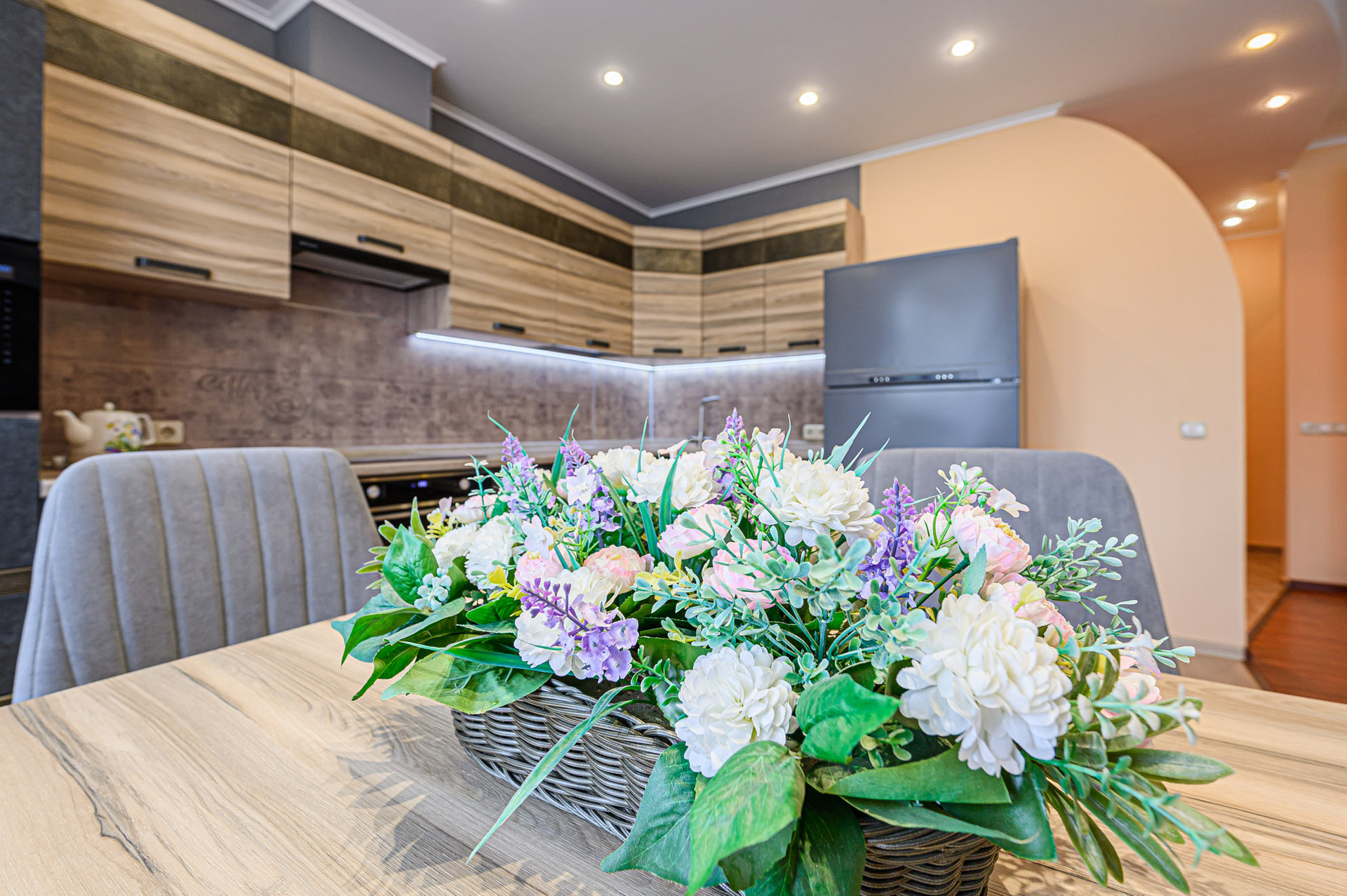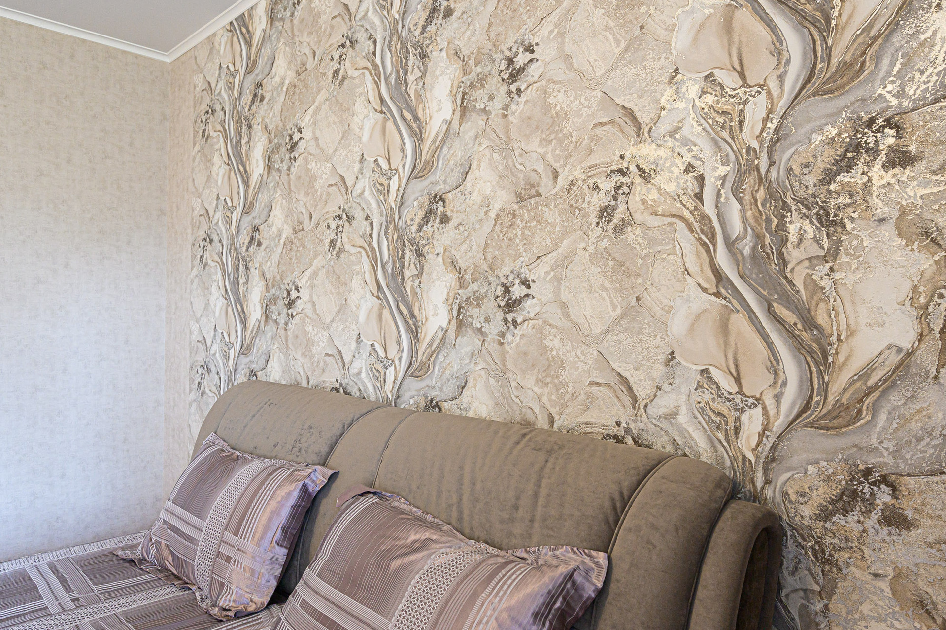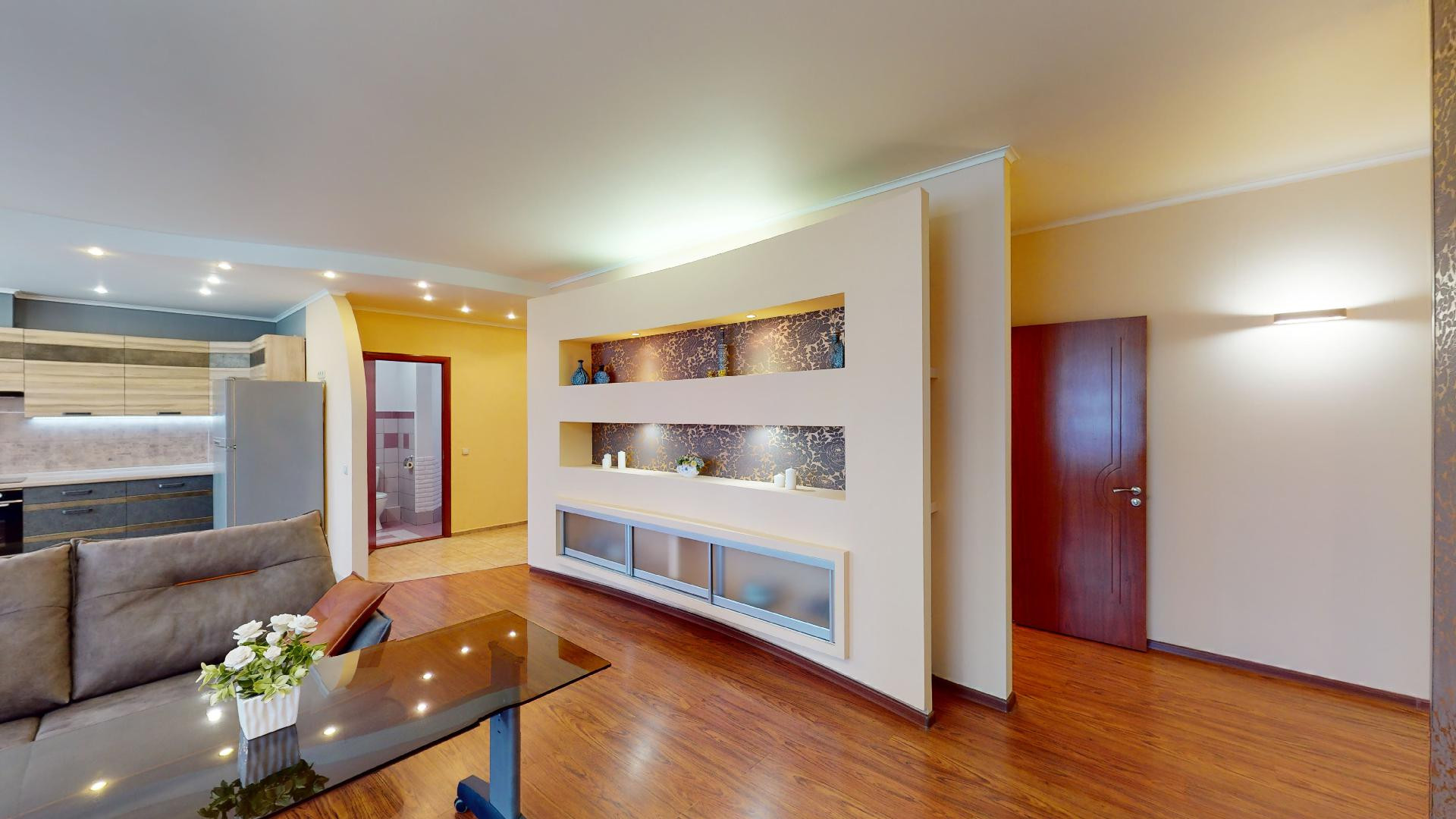 Сделан качественный ремонт, после которого еще никто там не жил. Благородные нейтральные тона, обои под покраску, местами – панно из итальянских обоев, много стильных элементов декора с полочками. На полу – ламинат, в холле и санузлах – керамогранит. Высокие потолки, разноуровневое освещение. В комнатах – кондиционеры.