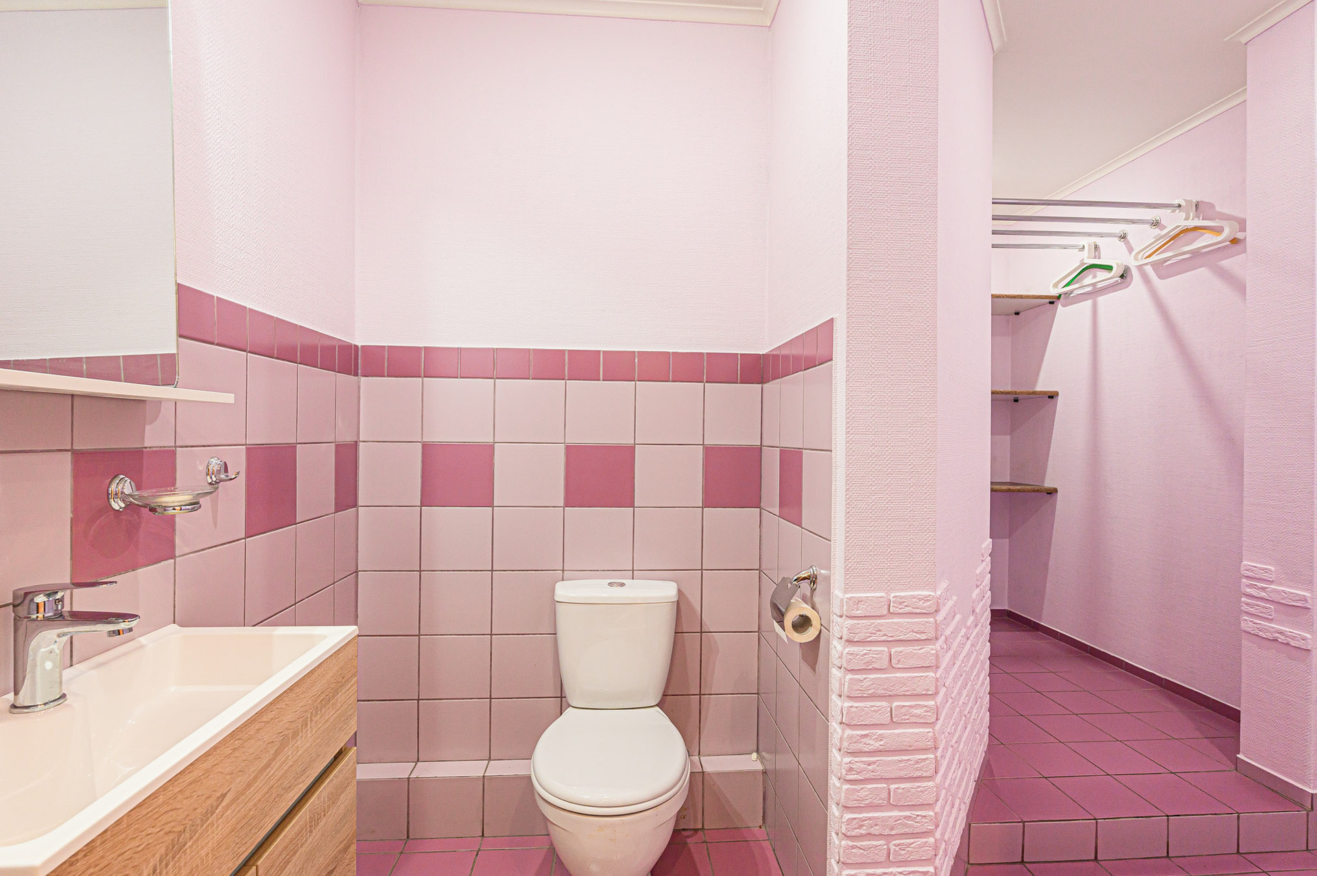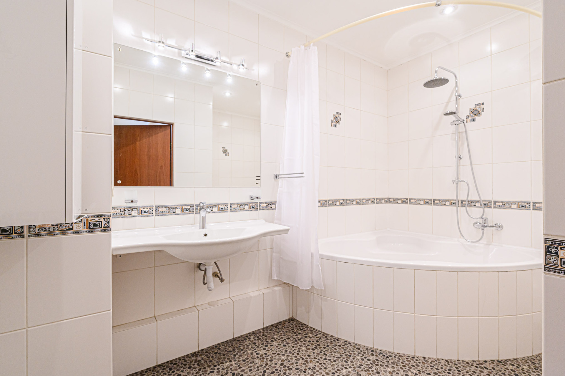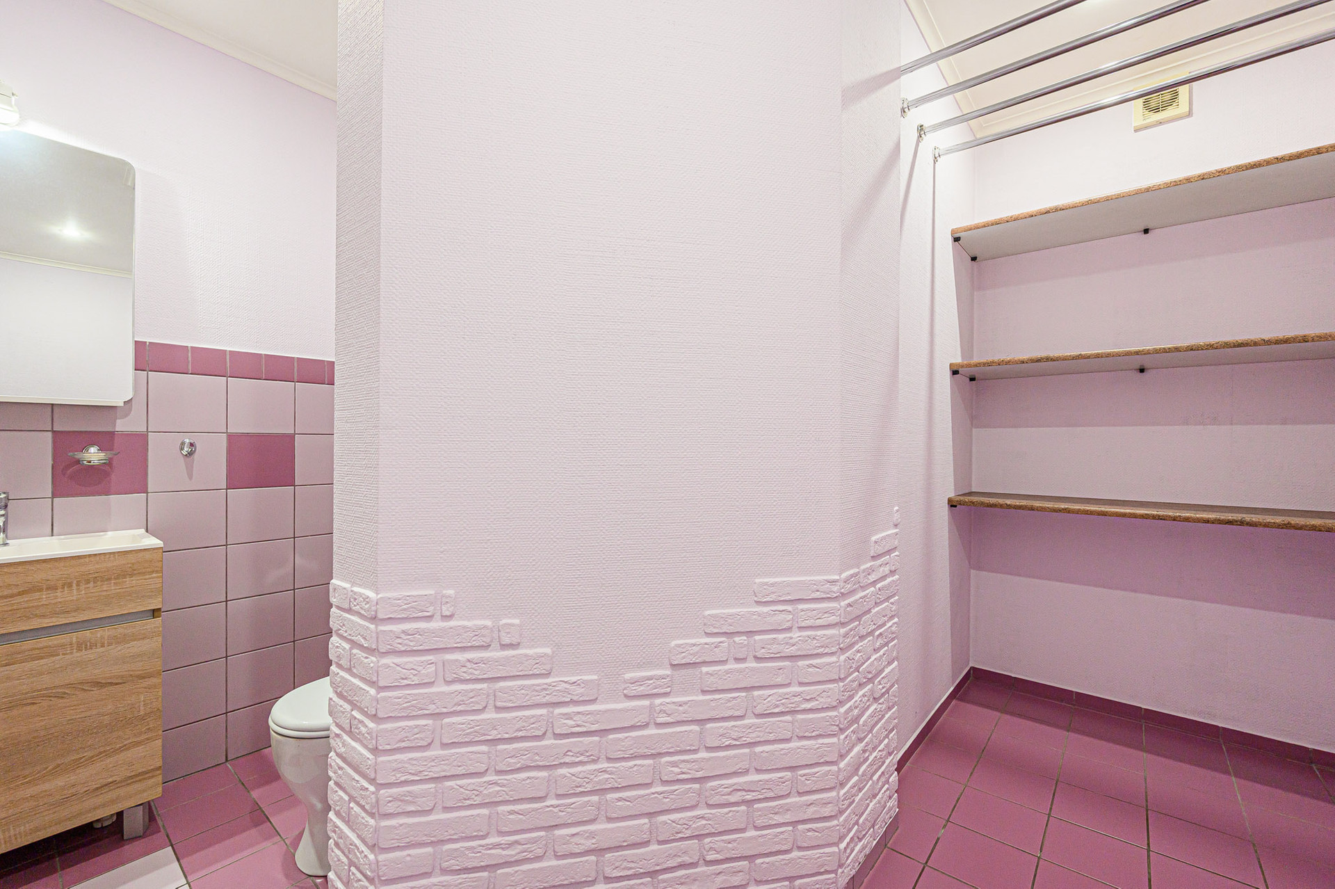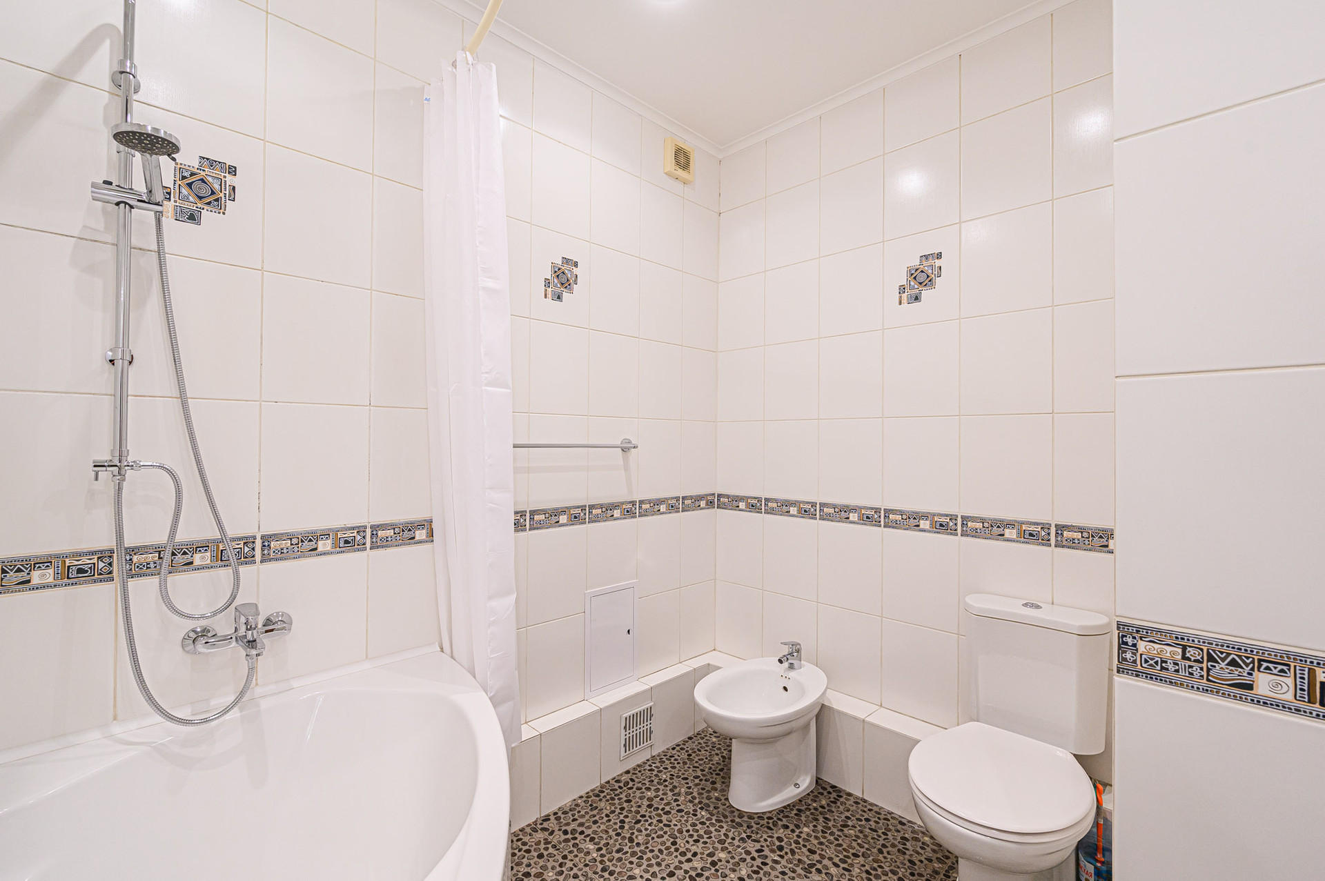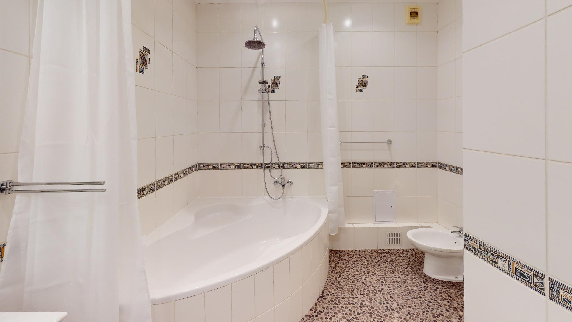 Вместительная прихожая, два санузла с отделкой из испанской плитки – в гостевом есть разводка под котел и стиральную машинку, а также место для постирочной и небольшого гардероба; в основном – большая ванна, тропический душ, унитаз, биде.