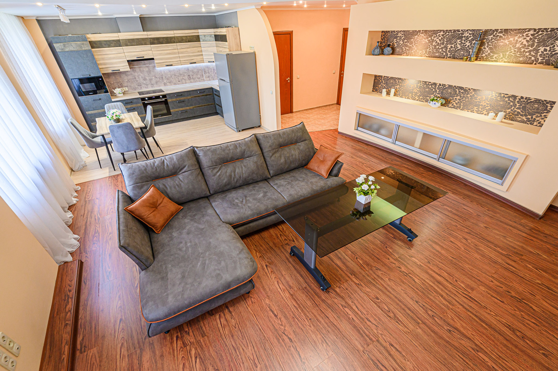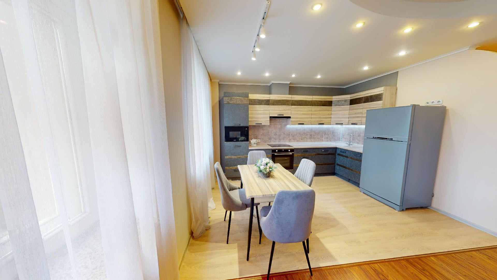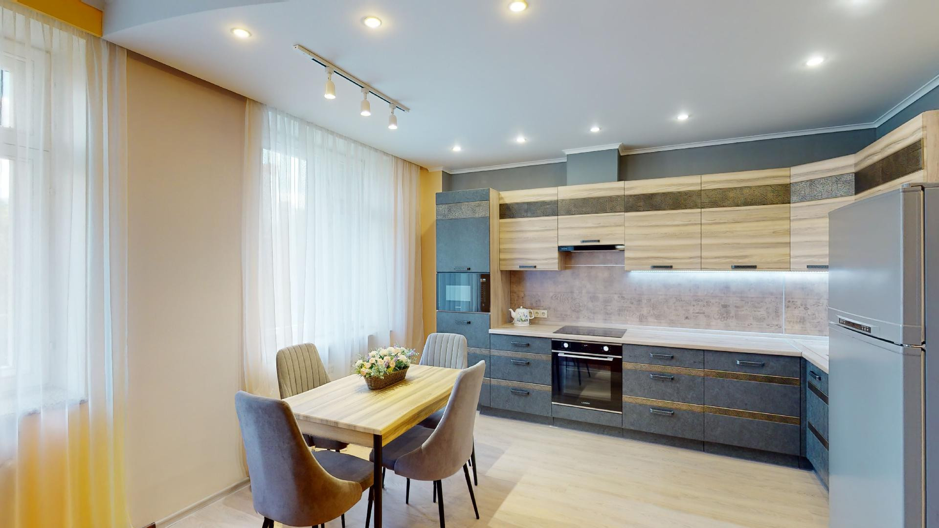 Просторная кухня-гостиная (55,6 м2) с тремя окнами, встроенным кухонным гарнитуром, оснащенным бытовой техникой европейских брендов (варочная панель - индукция, духовой шкаф, вытяжка, посудомоечная машина, фильтр для воды, холодильник, микроволновка).