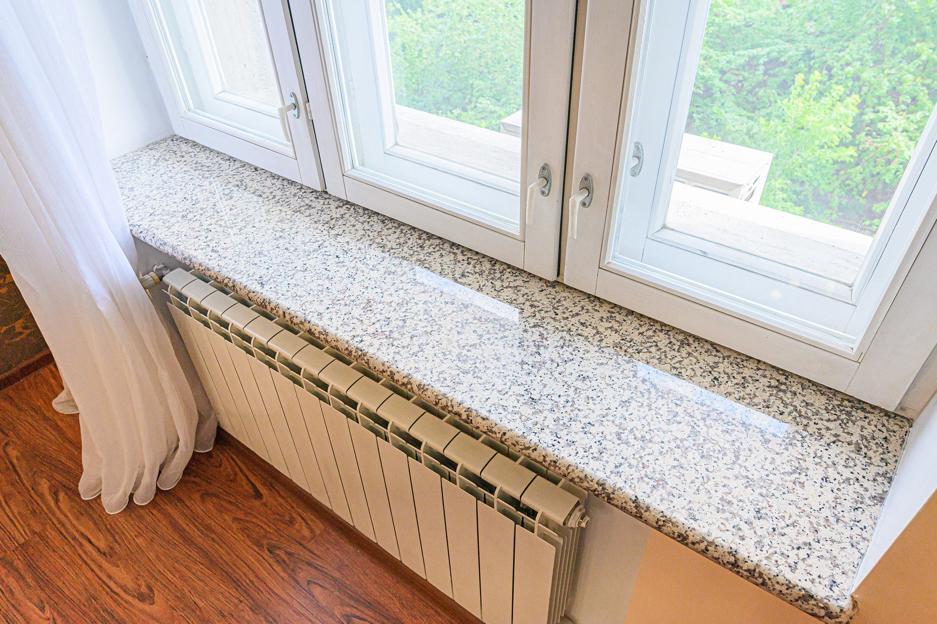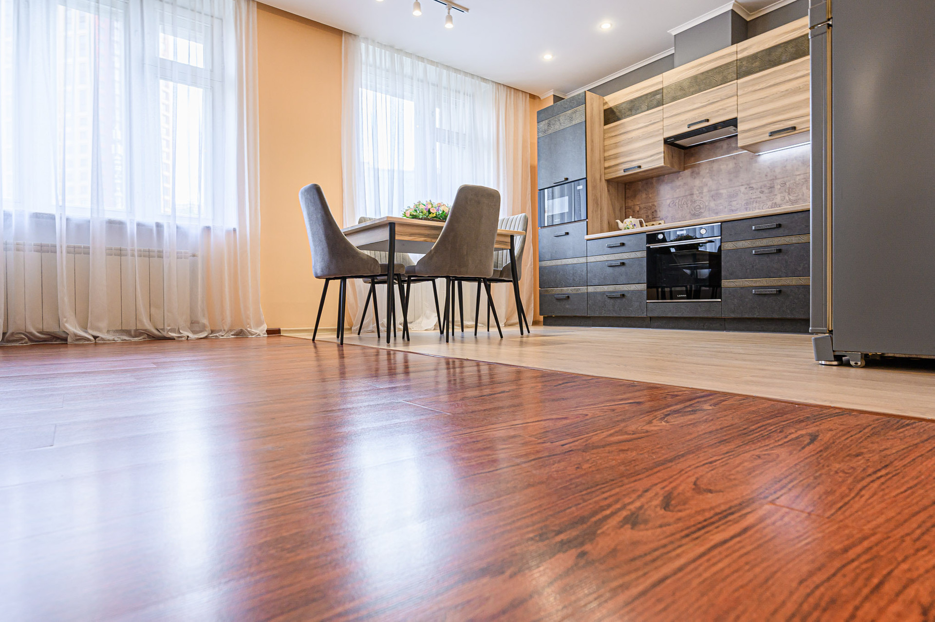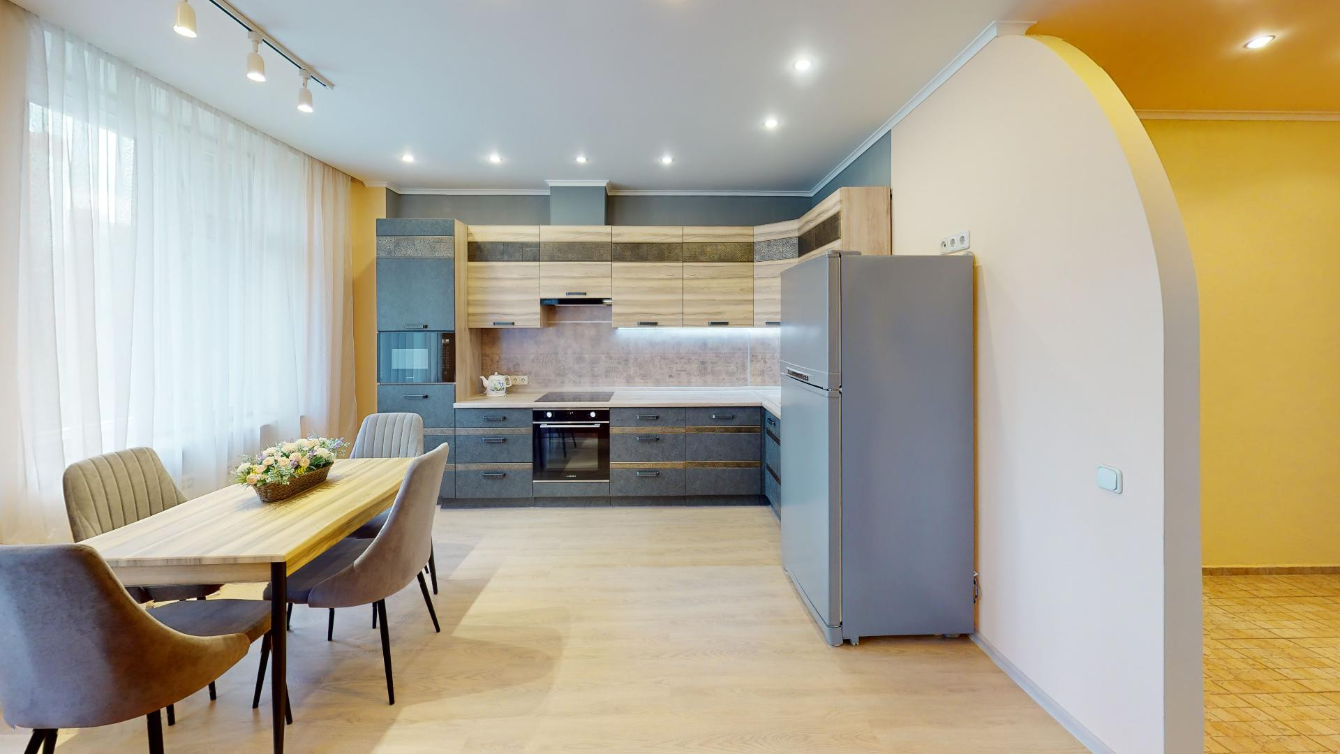 Просторная кухня-гостиная (55,6 м2) с тремя окнами, встроенным кухонным гарнитуром, оснащенным бытовой техникой европейских брендов (варочная панель - индукция, духовой шкаф, вытяжка, посудомоечная машина, фильтр для воды, холодильник, микроволновка).