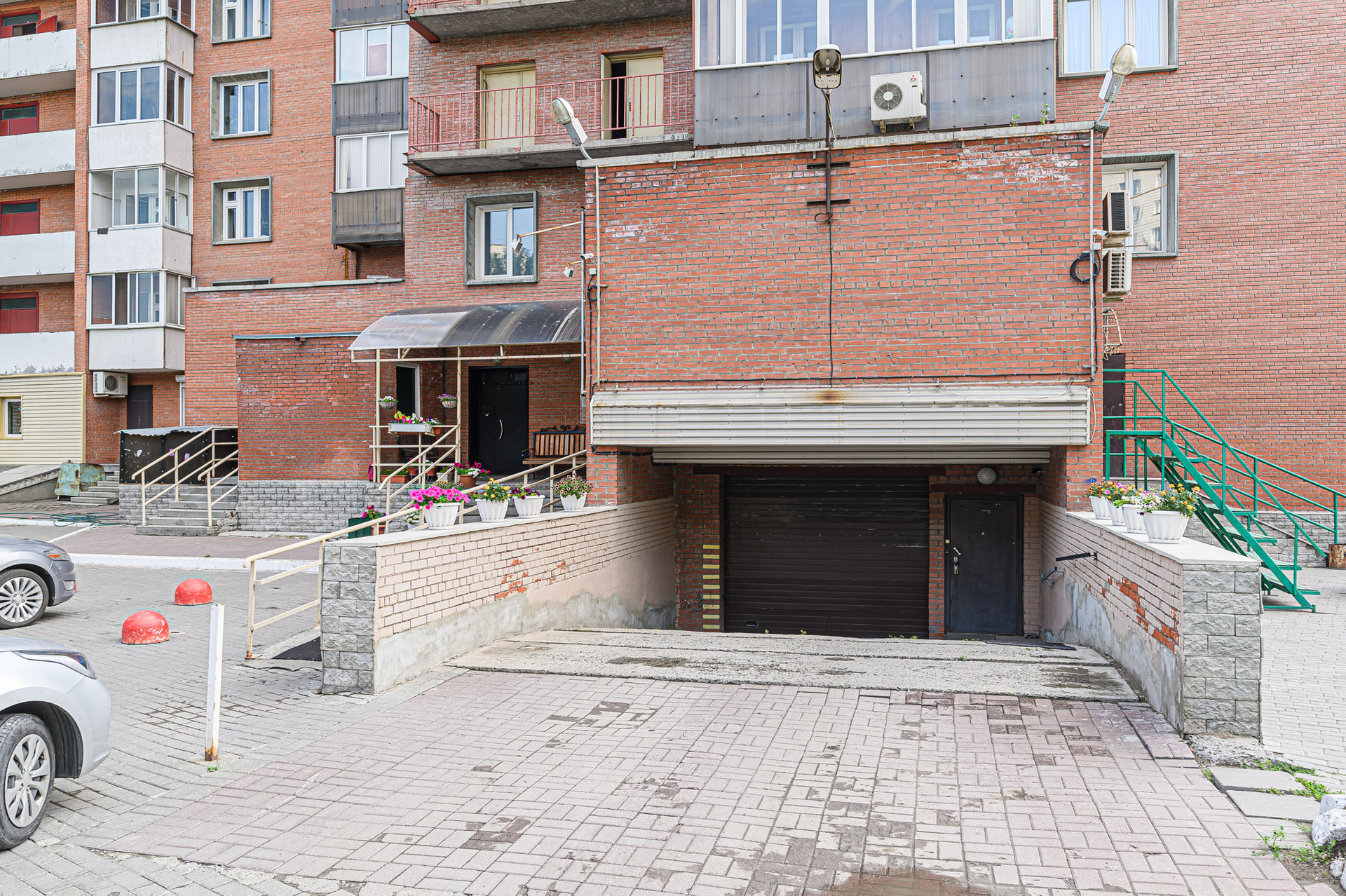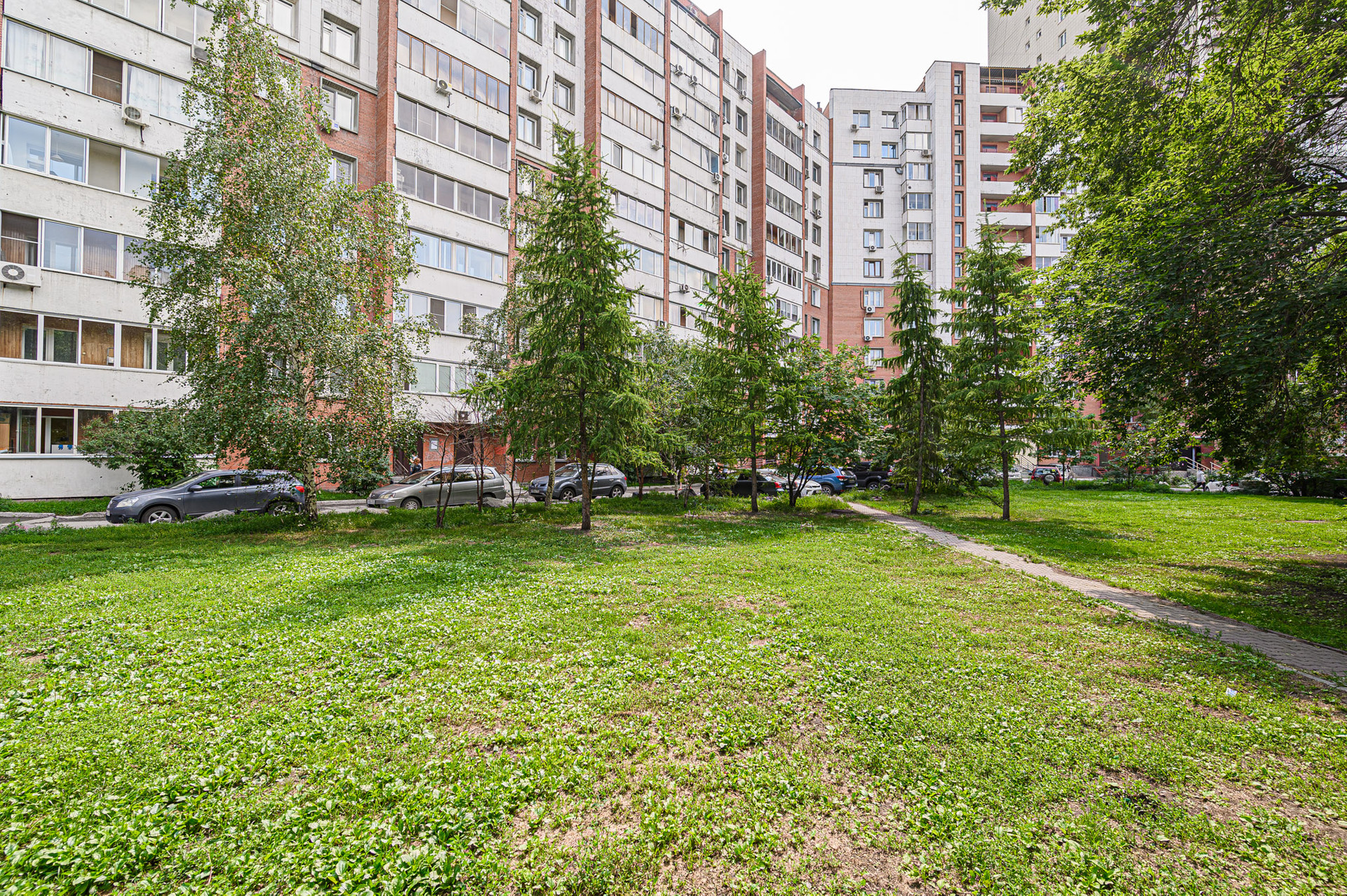 Во дворе много зелени, есть детская площадка, хоккейная коробка, зоны отдыха, наземный и подземный паркинг.