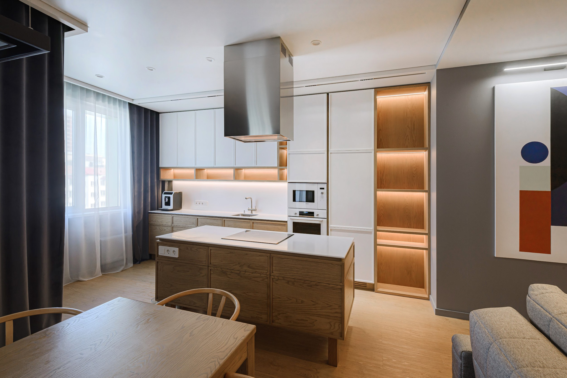 Полностью оборудованная кухня со всей необходимой встроенной техникой: холодильник, духовка, варочная поверхность, посудомойка, СВЧ, вытяжка. Фильтрация воды.