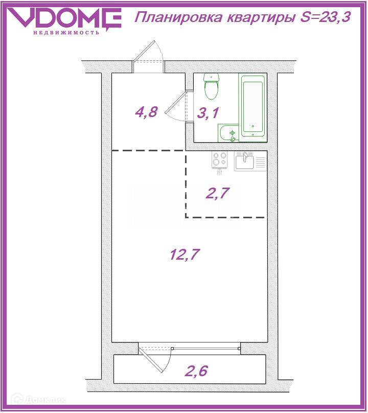 Общая площадь 23.3 м2