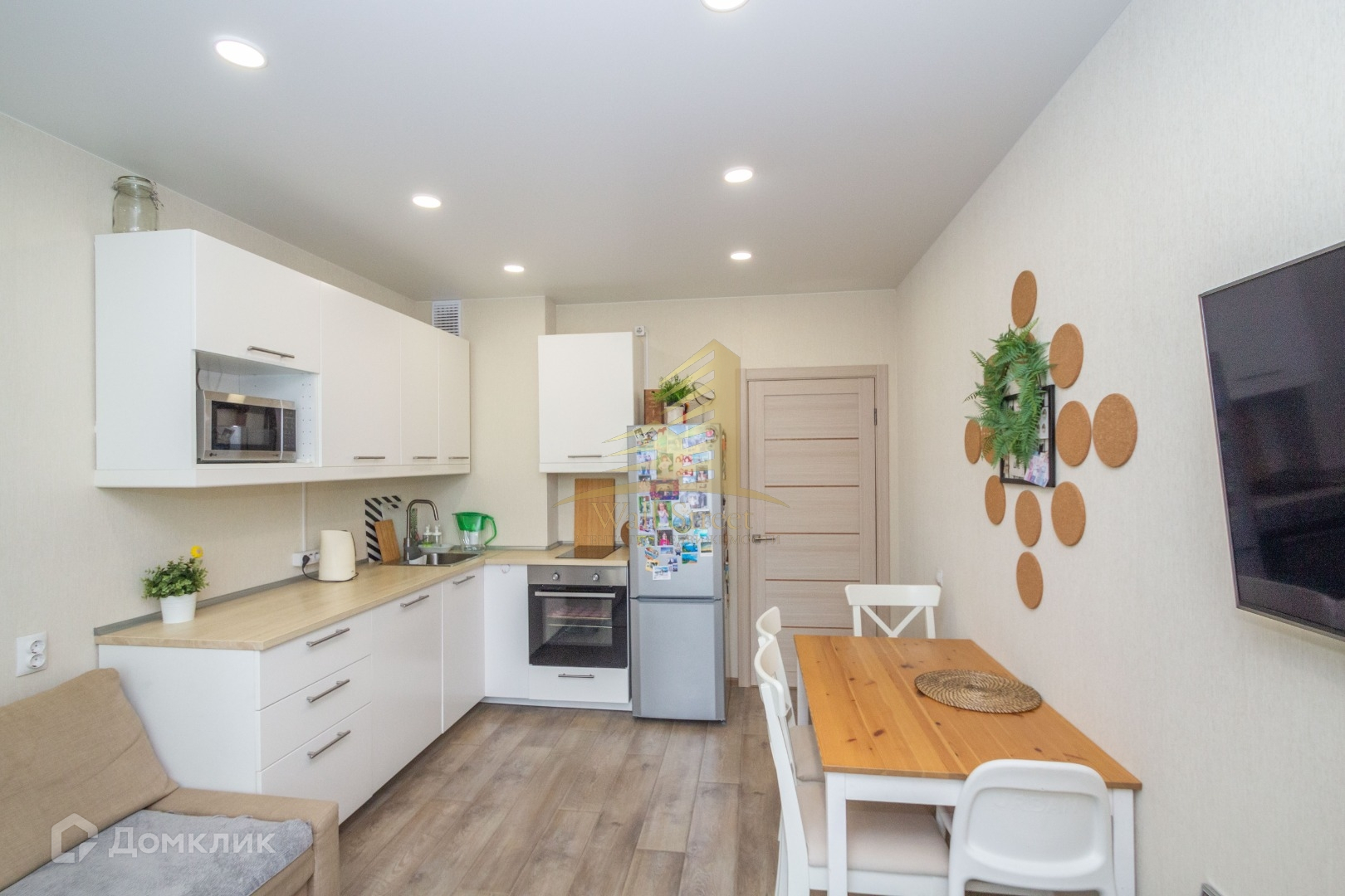 В подарок покупателям остается кухонный гарнитур со встроенной техникой и шкаф в прихожей.