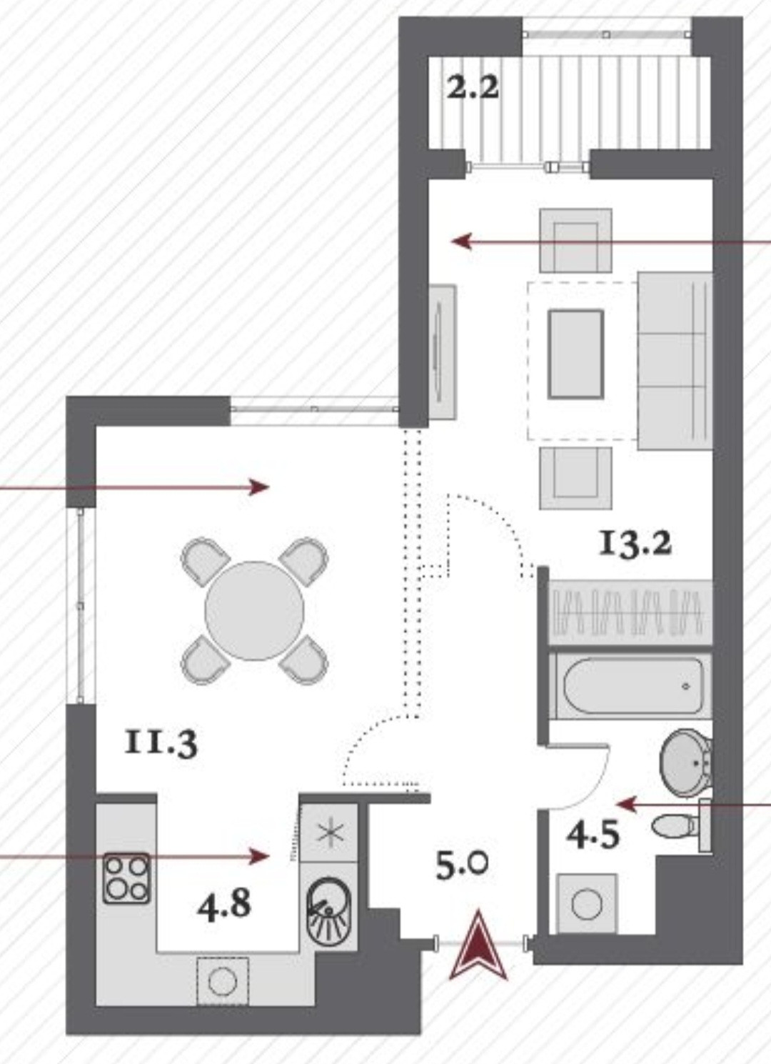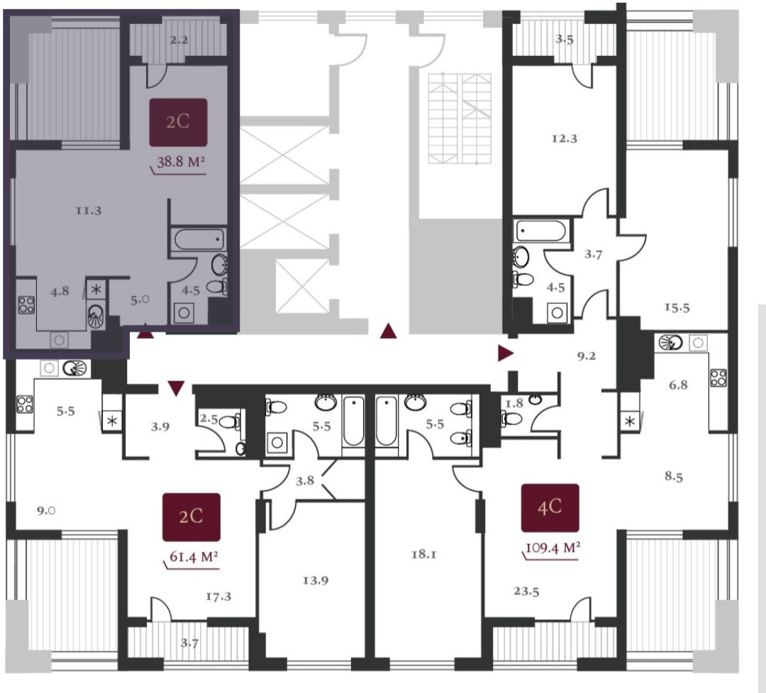 Общая площадь 38.8 м2
