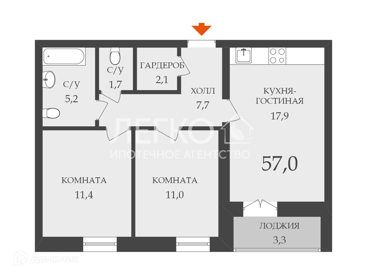 - две изолированные спальни (11,4 кв.м., 11,0 кв.м);