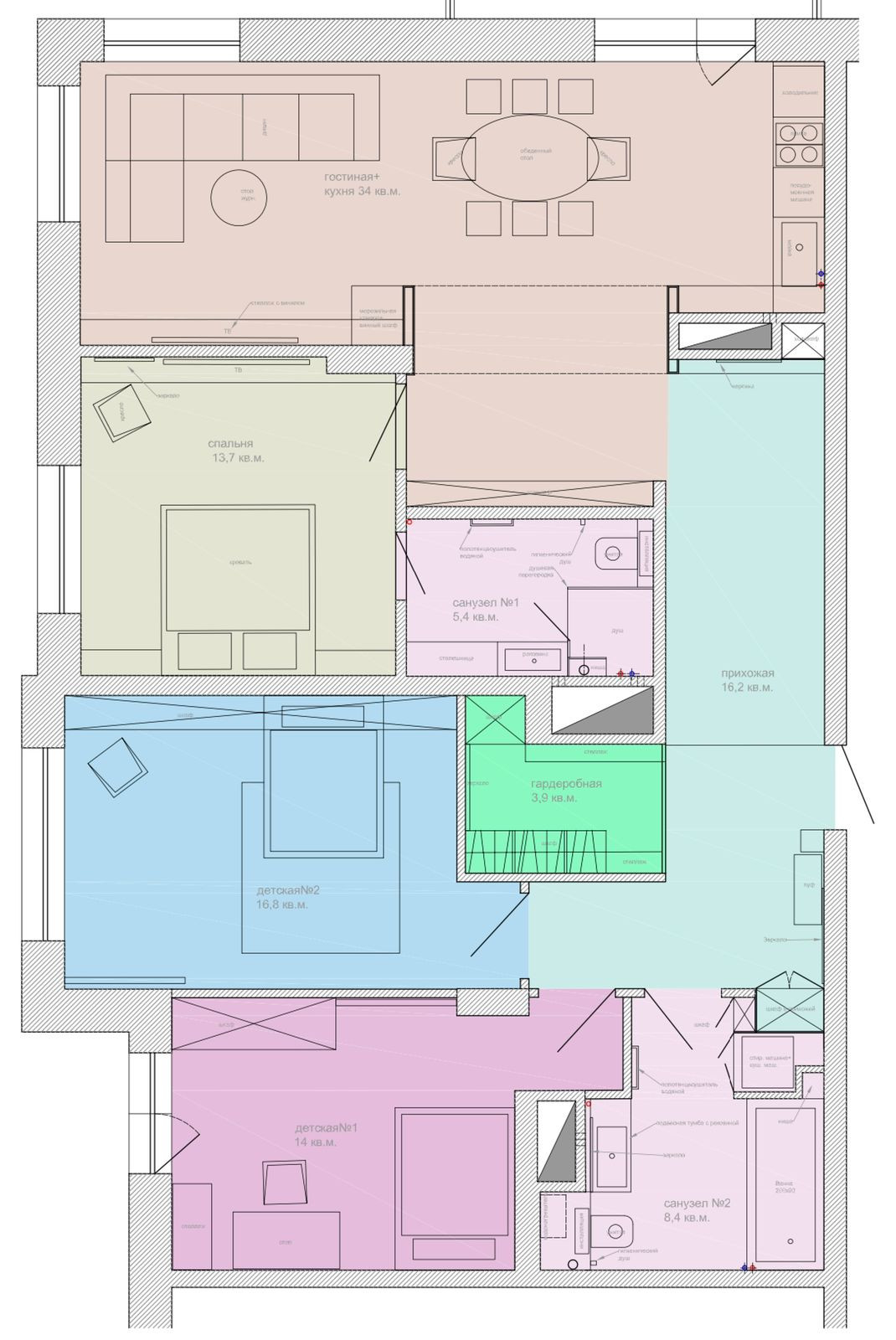 - остается вся встроенная техника ( посудомойка, холодильник, варочная поверхность, духовой шкаф), кухонный гарнитур, встроенная мебель в сан.узле,