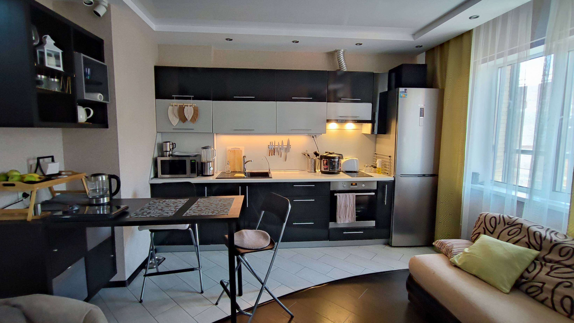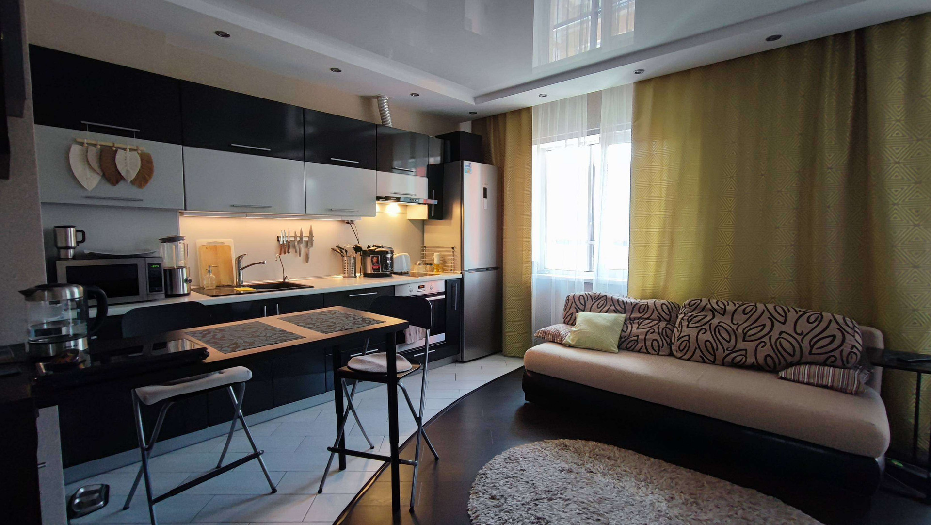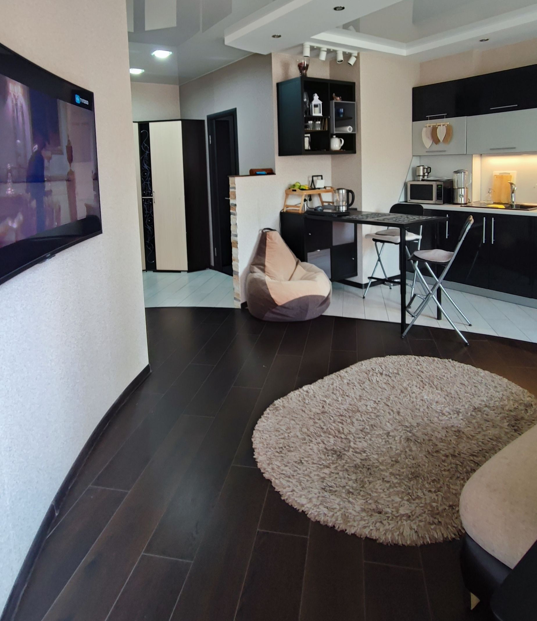 Зонирование: прихожая, гардеробная , санузел,  кухня гостиная,  спальное место двухспальная кровать . Остаётся вся мебель и техника.
