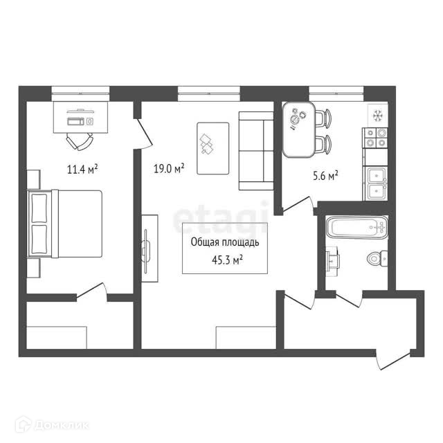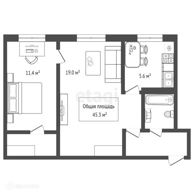 Общая площадь 45.3 м2