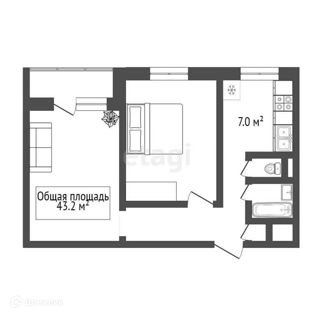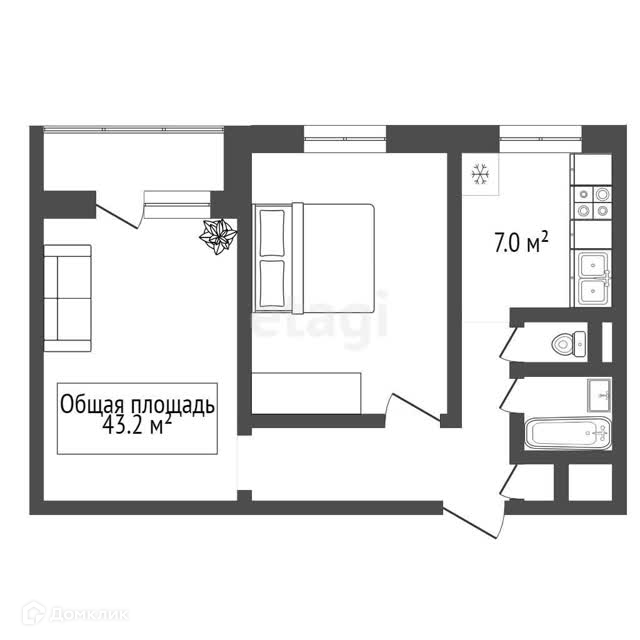 Общая площадь 43.2 м2