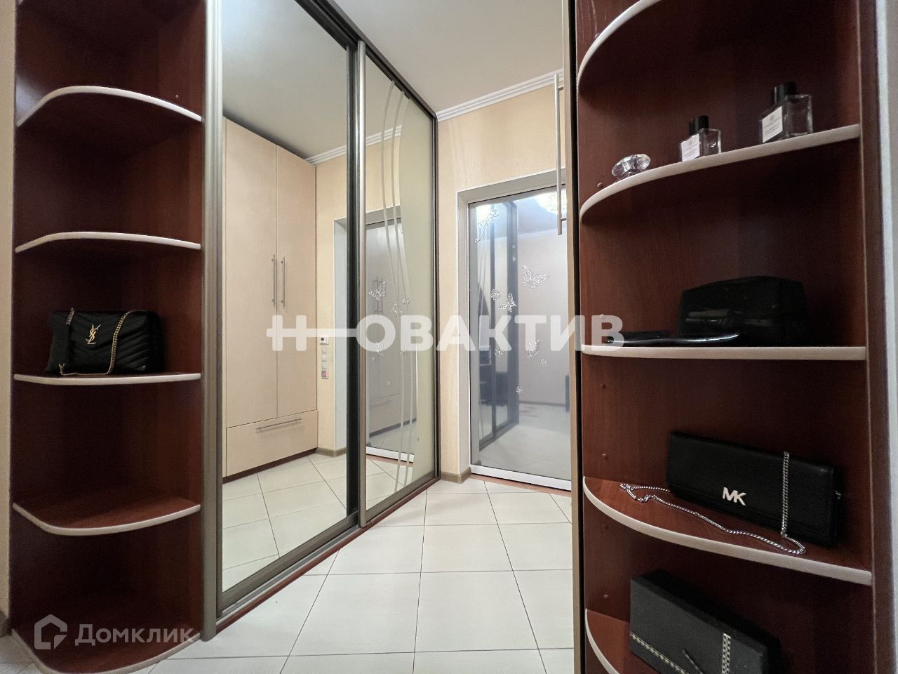 Прихожая просторная и функциональная, с большим количеством мест для хранения вещей, в том числе полками и шкафом-купе с зеркалом. На выходе косметическое зеркало с тумбой под обувь.