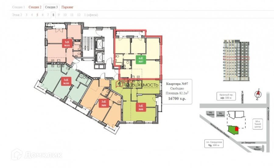 Квартира студия, 82.2 м2, этаж 8 / 16, на продажу в Новосибирске, Коммунистическая улица, 10