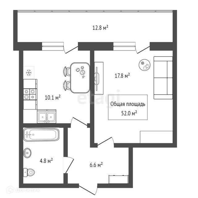 Общая площадь 52 м2