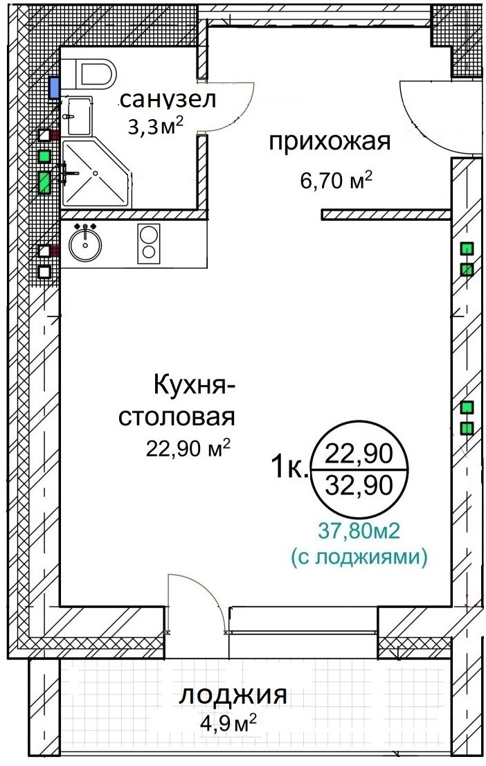 Общая площадь 37.8 м2