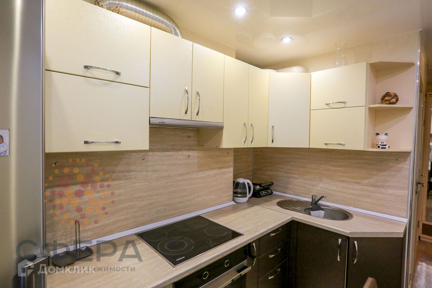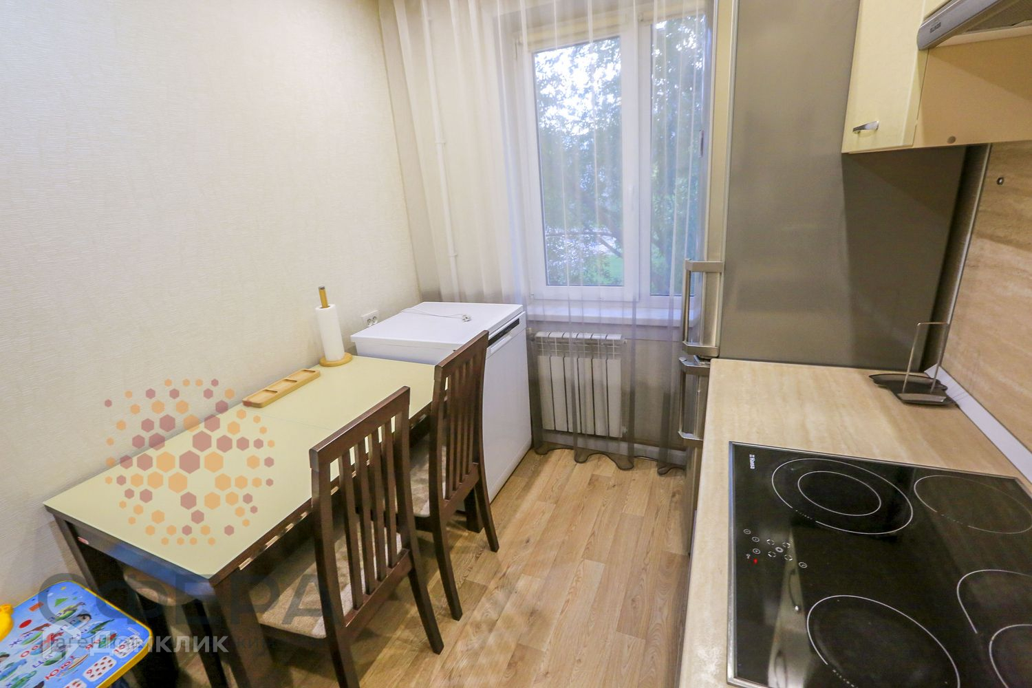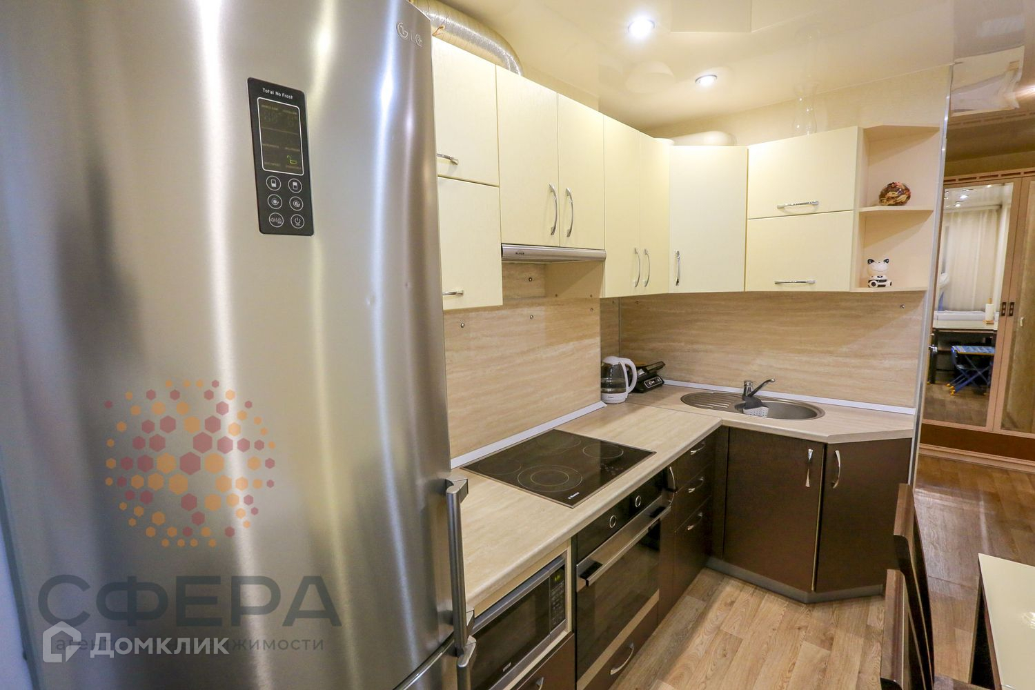 В квартире остается хороший кухонный гарнитур с духовкой и варочной панелью, шкафы в прихожей.