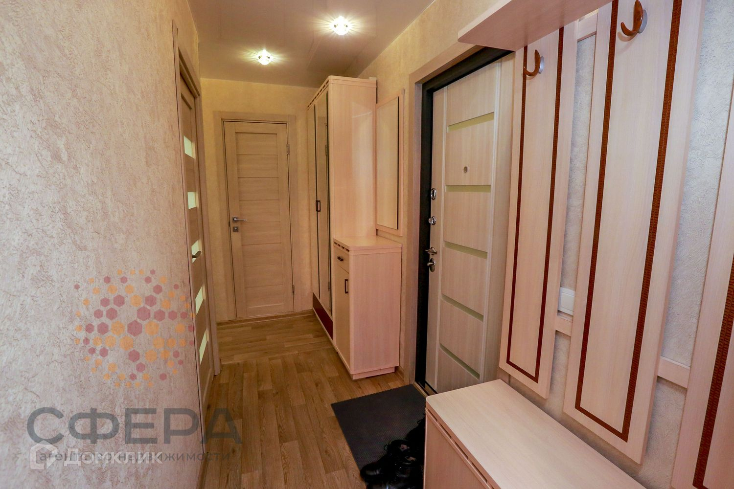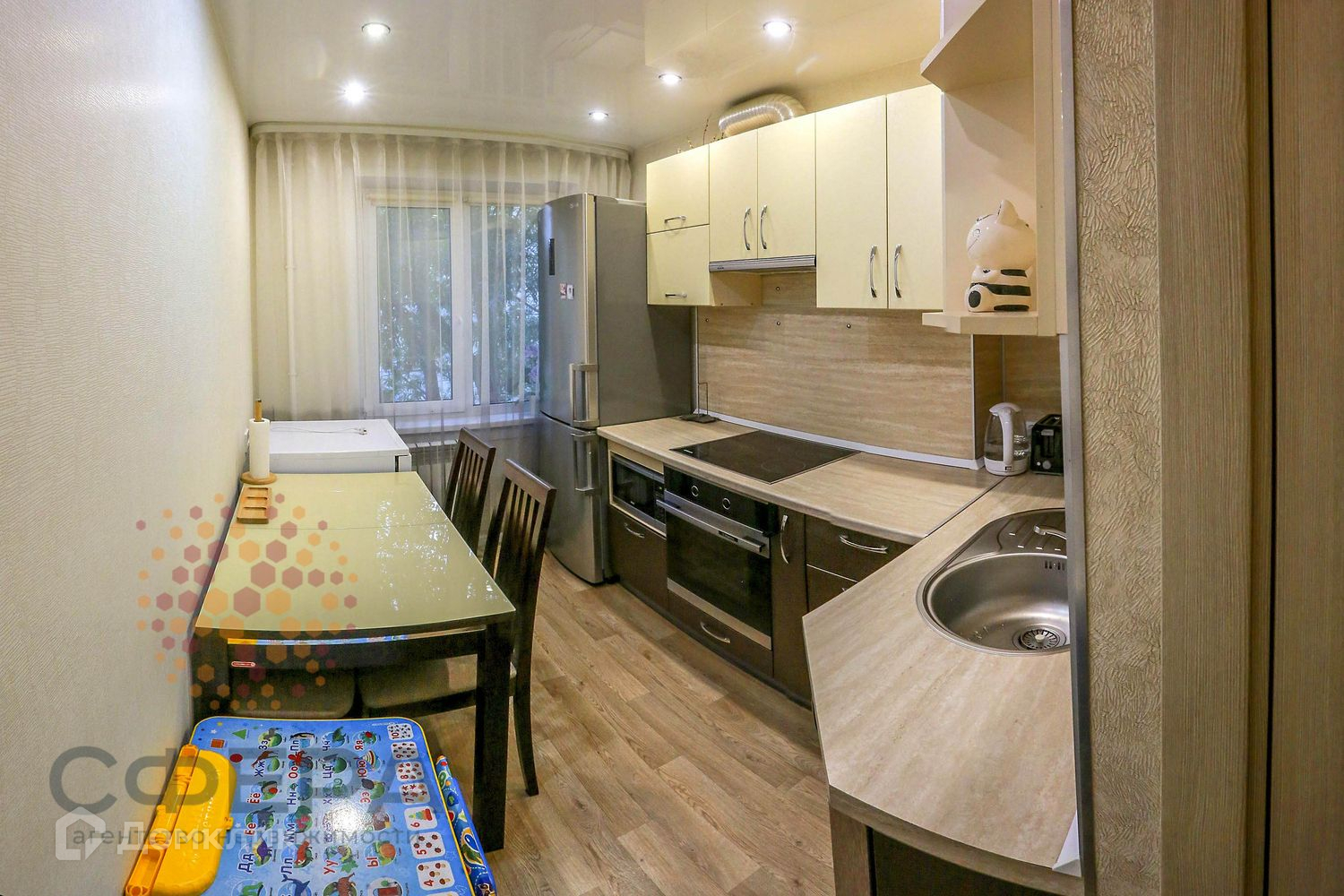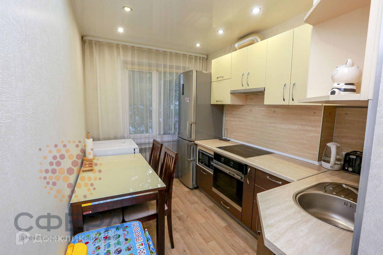 В квартире установлены пластиковые окна, биметаллические батареи. Стены выровнены, наклеены качественные обои. Залита новая цементная стяжка, уложен ламинат и настелен линолеум. Заменена разводка по электрике и воде. Натяжные потолки, современные междкомнатные и входная двери. В ванной и туалете выложен кафель, установлена новая сантехника.