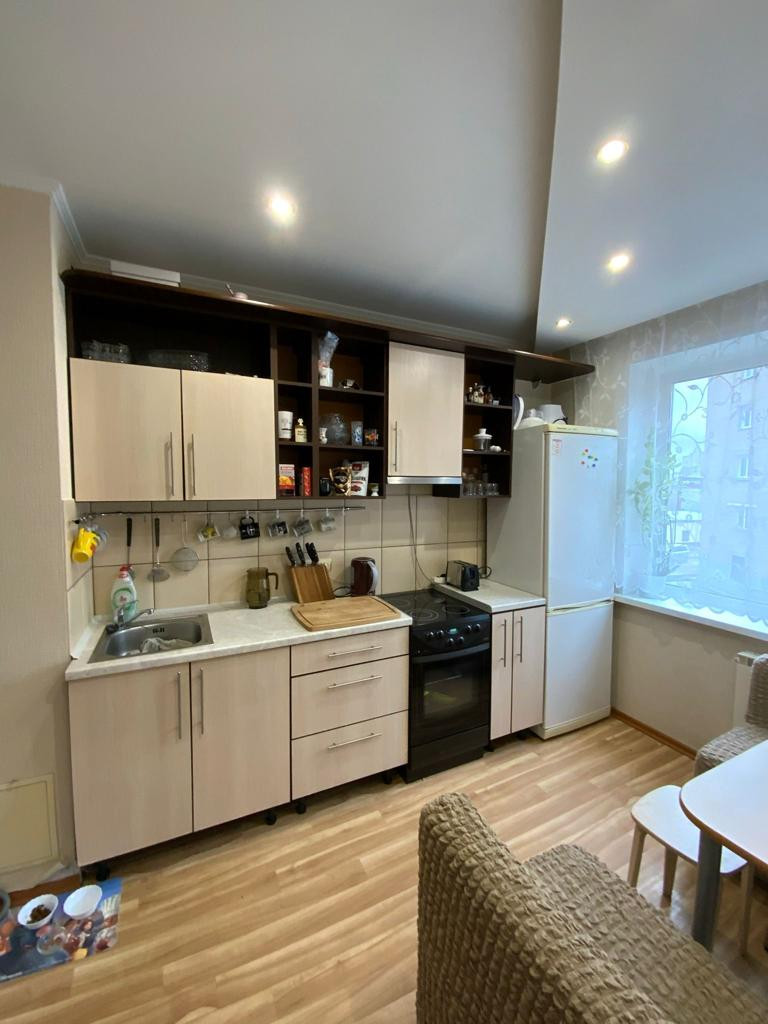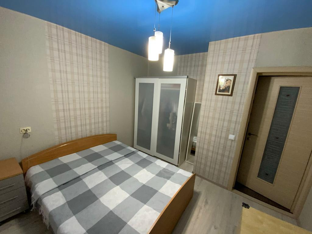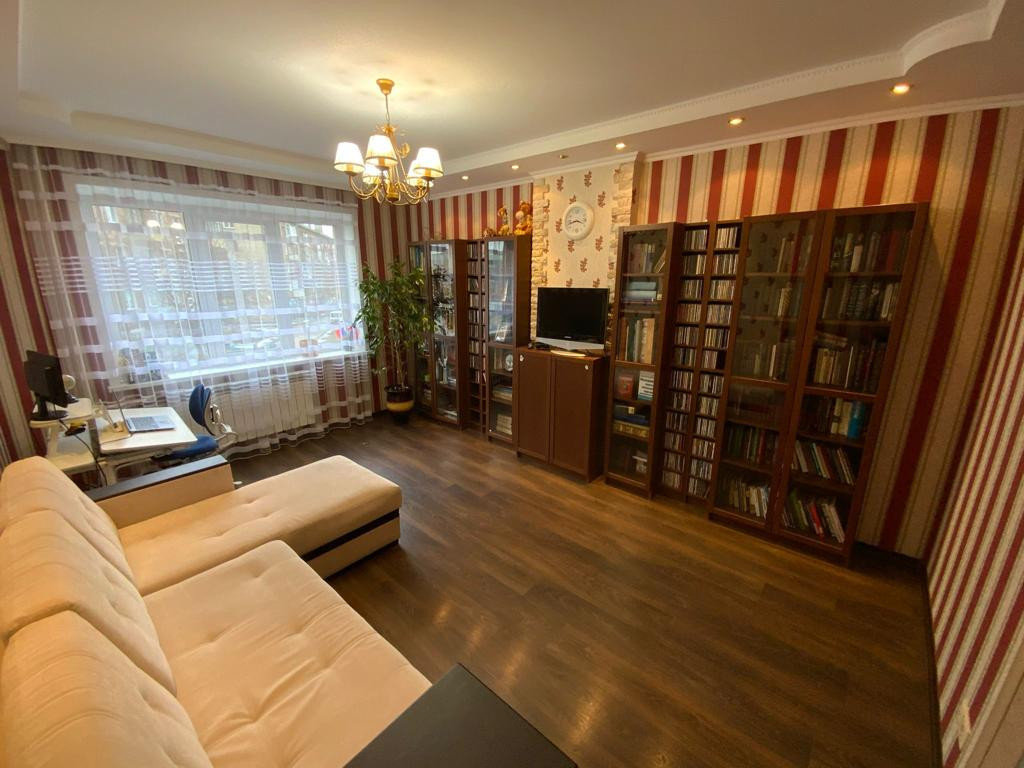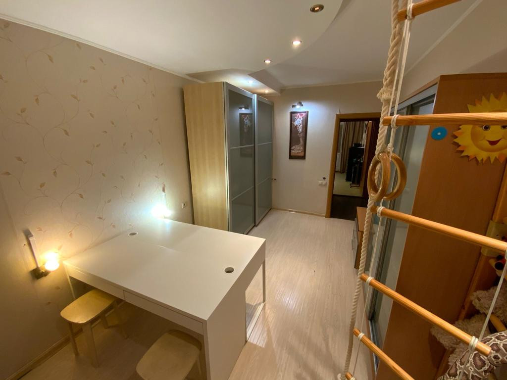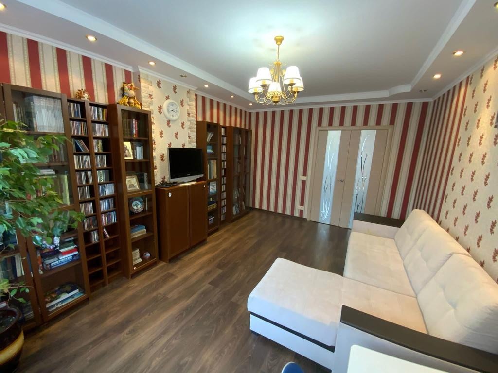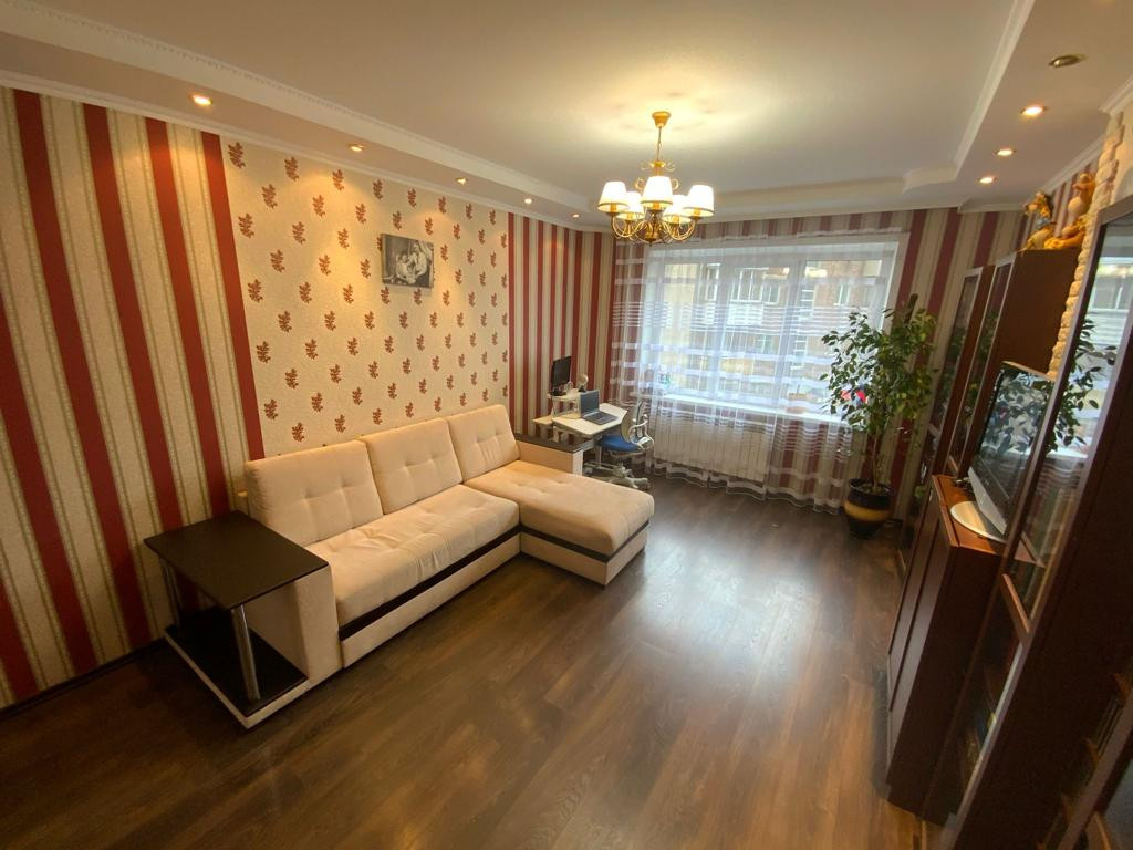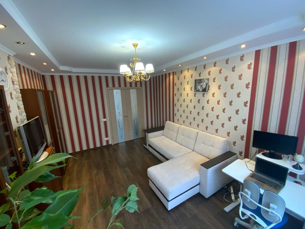 В квартире выполнен качественный ремонт (делали для себя). Хорошие обои, на полу линолеум и ламинат, двухуровневые потолки, элементы декора на стенах, кафель в сан узлах, деревянные межкомнатные двери. Установлены пластиковые окна.