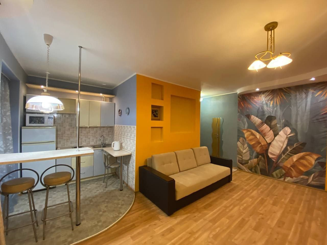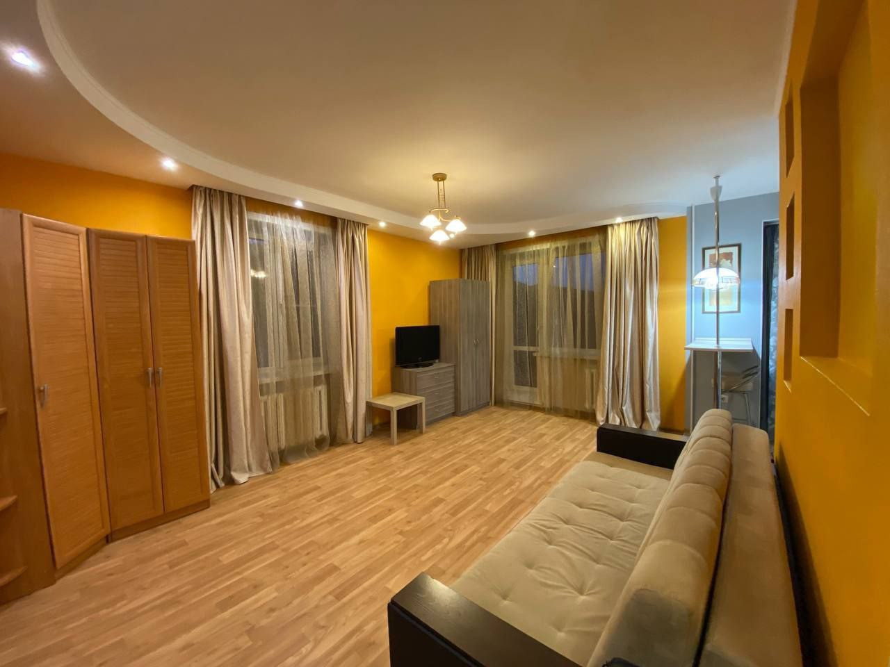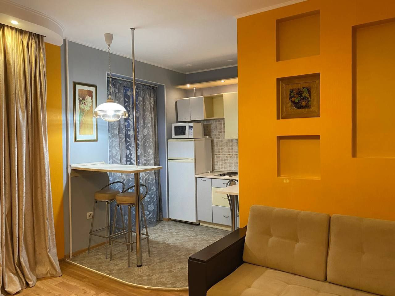 Внутри квартиры вас ждет все необходимое для комфортного проживания. Просторная планировка, высокие потолки и большие окна создают ощущение пространства и света. Здесь вы найдете функциональную кухню, уютную гостиную- спальню.