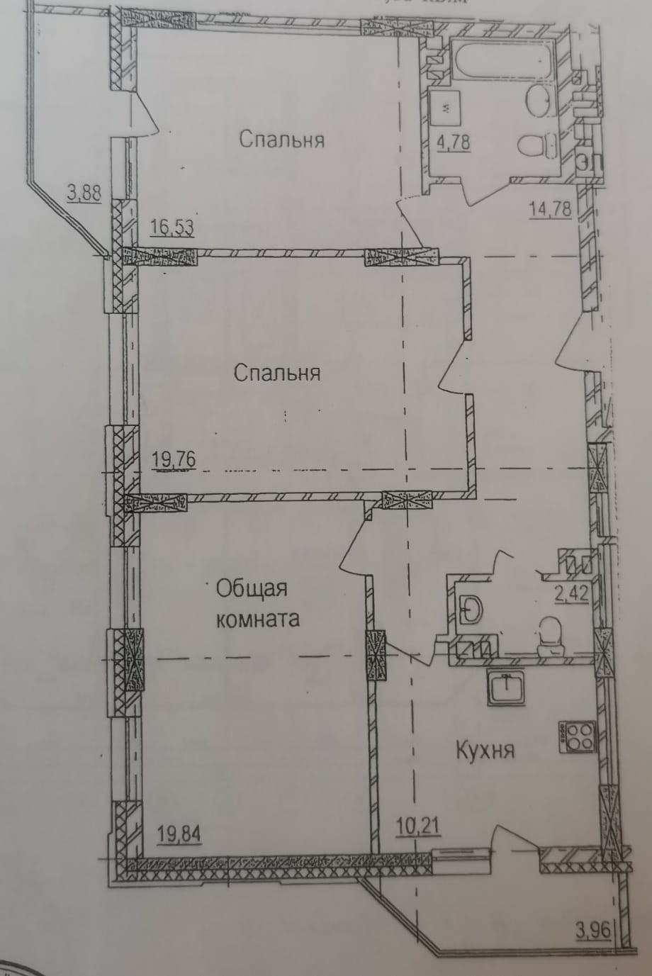 Общая площадь – 88,32 кв.м, жилая – 56,13 кв.м., гостиная- 19,76, спальня - 19,84, спальня – 16,53, кухня - 10,21 кв.м. Удобная планировка , в квартире 2 большие лоджии с витражным остеклением.