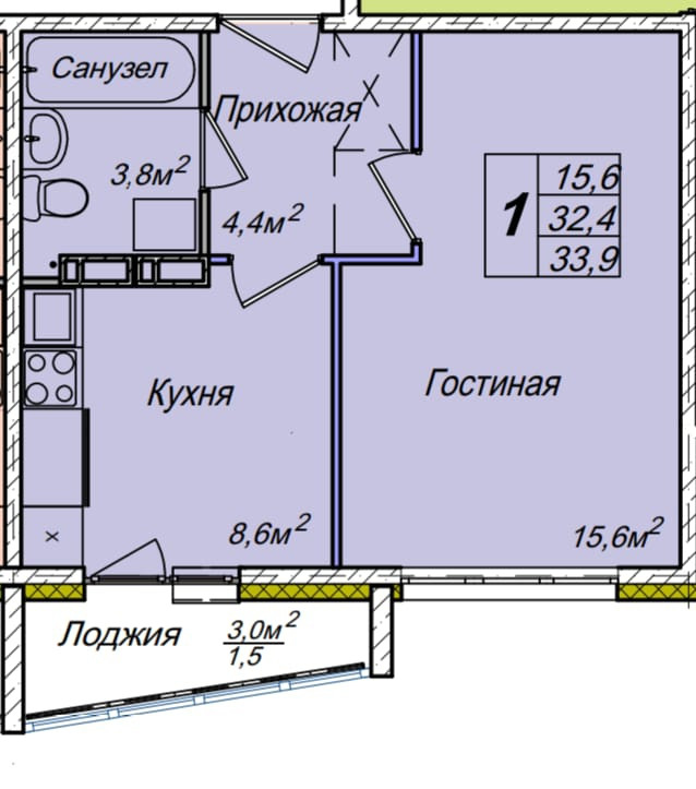 Общая площадь 35.5 м2