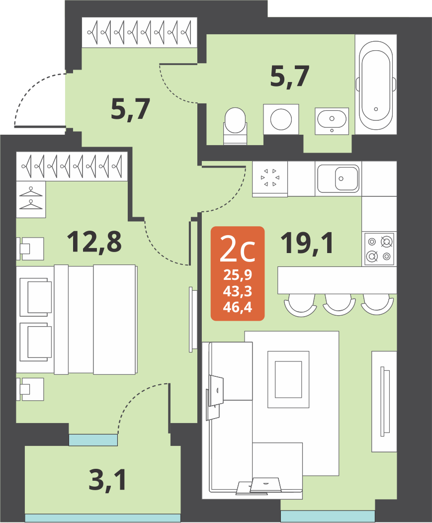 Общая площадь 43 м2