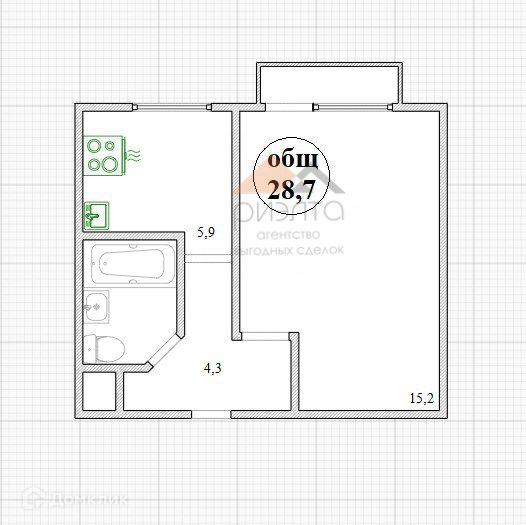 Общая площадь 28.7 м2