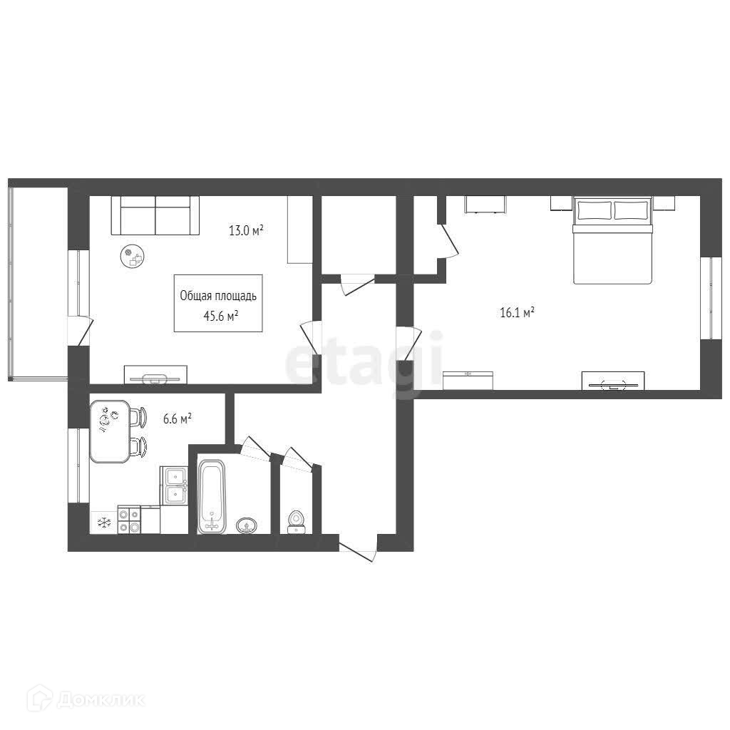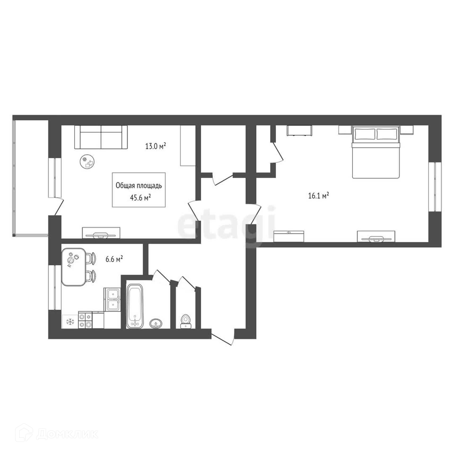 Общая площадь 45.6 м2
