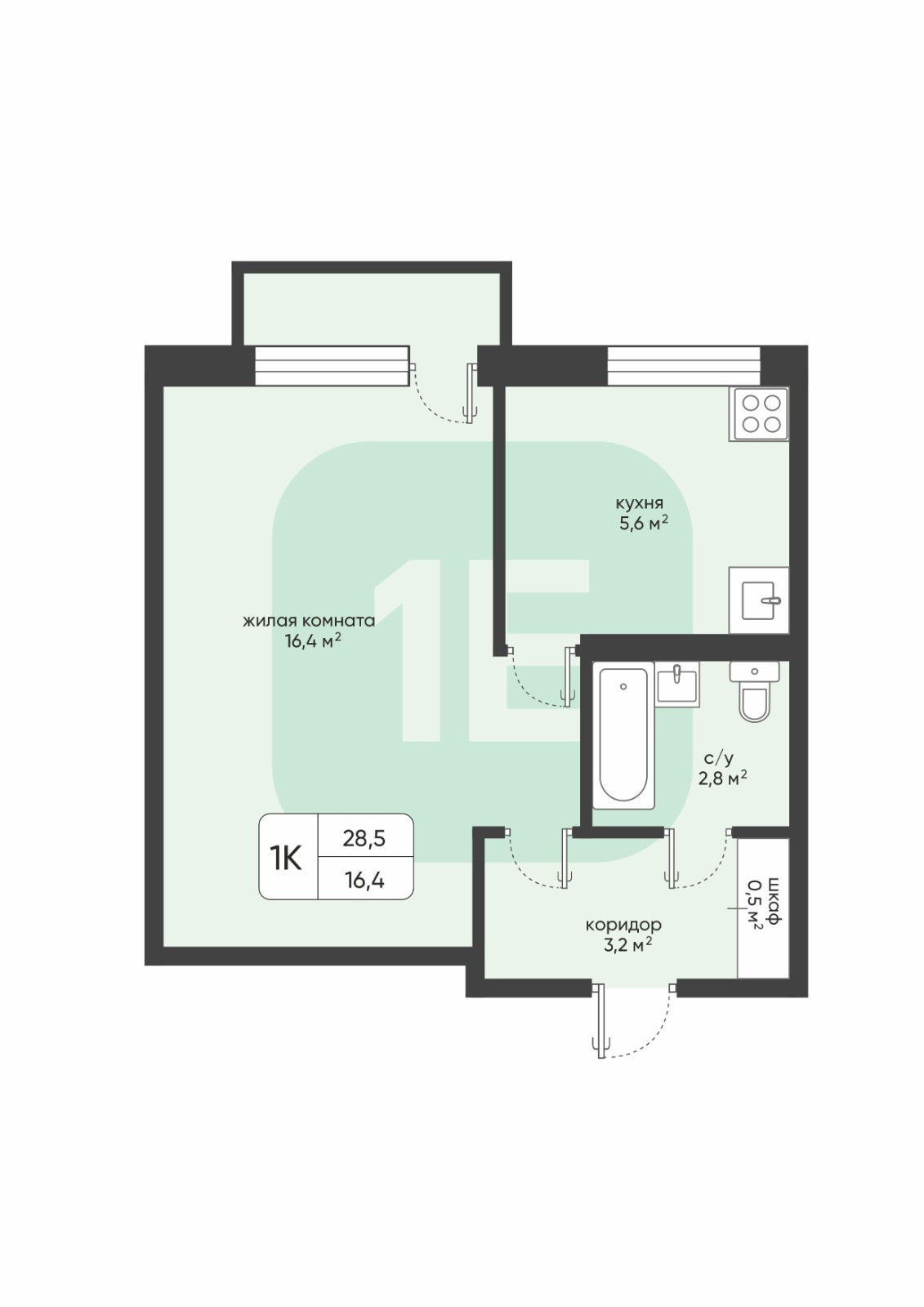 Общая площадь 28.5 м2