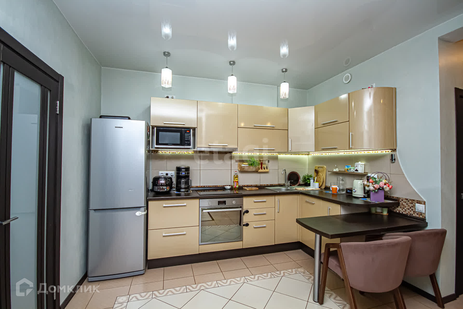 просторная кухня -гостиная площадью 20 кв.м., позволила разместить и современную, функциональную кухонную зону, со всей необходимой встроенной техникой и столовую, где легко может разместиться большая компания родных и друзей -идеальное место встреч;