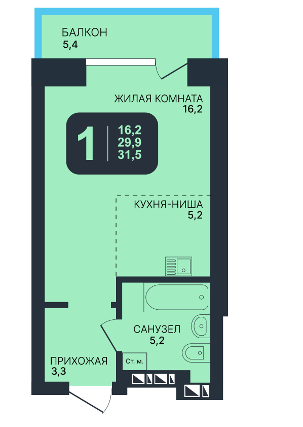 Общая площадь 31.5 м2