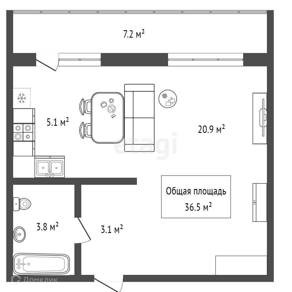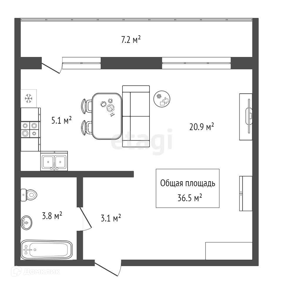 Общая площадь 36.5 м2