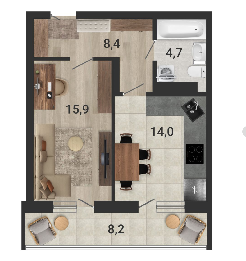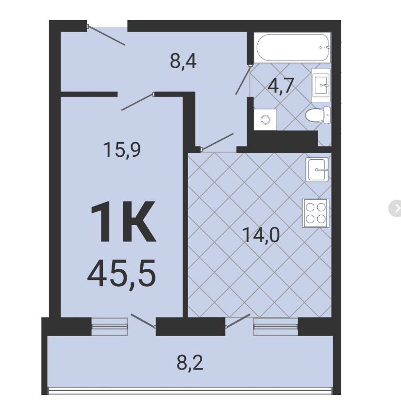 Общая площадь 45.5 м2