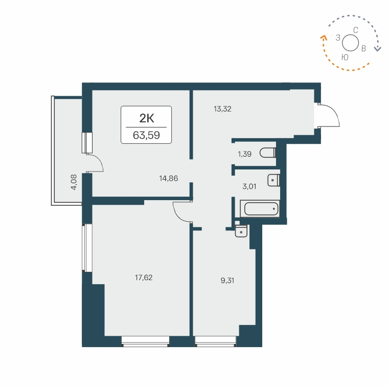 Общая площадь 63.59 м2