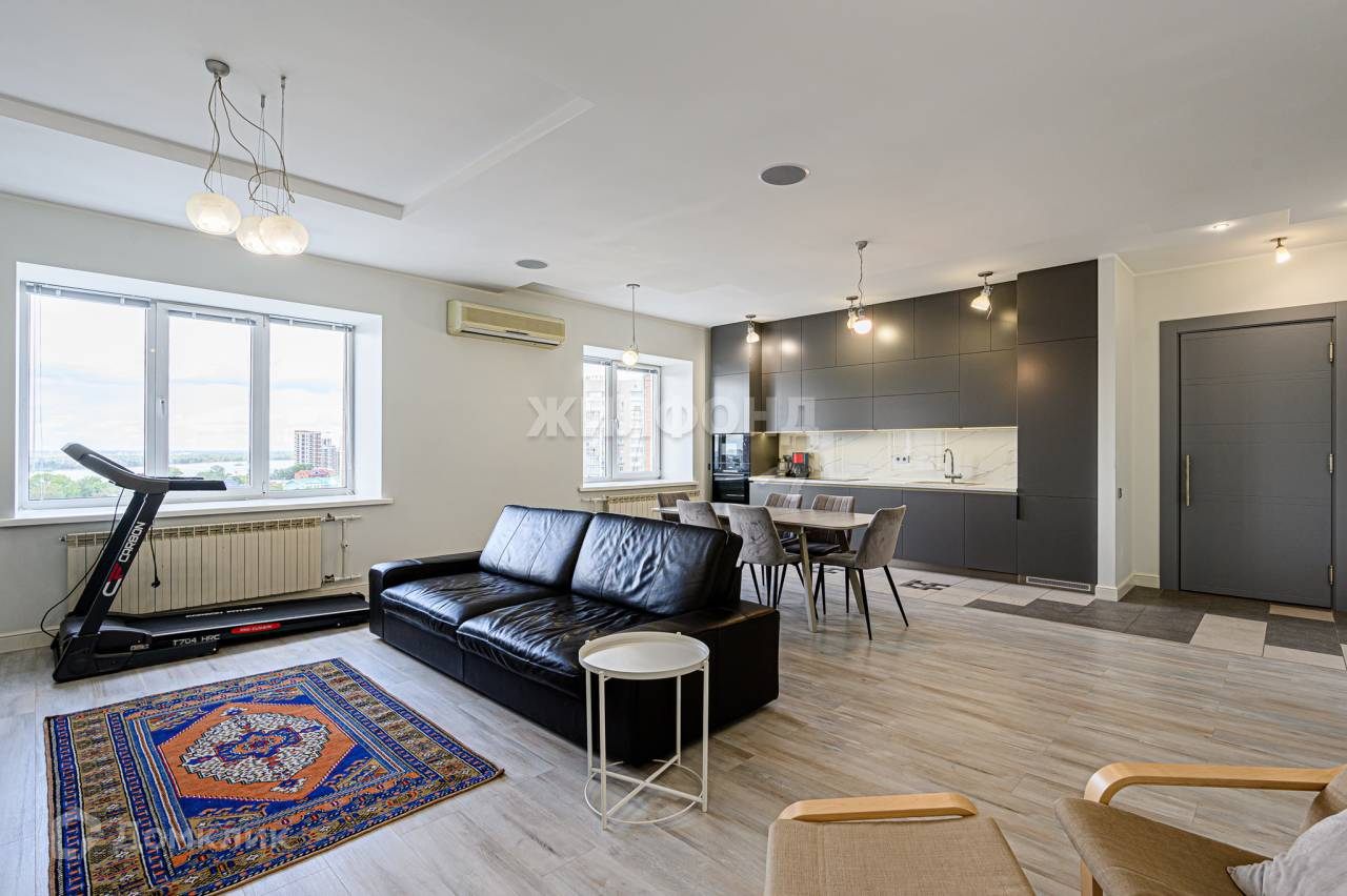 КУХНЯ-ГОСТИНАЯ 42,2 м2, вид на реку. СПАЛЬНЯ 15,6 м2 и ДЕТСКАЯ 19,9 м2 (окна выходят во двор, на гимназию).