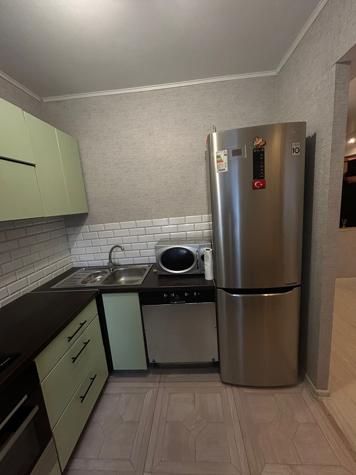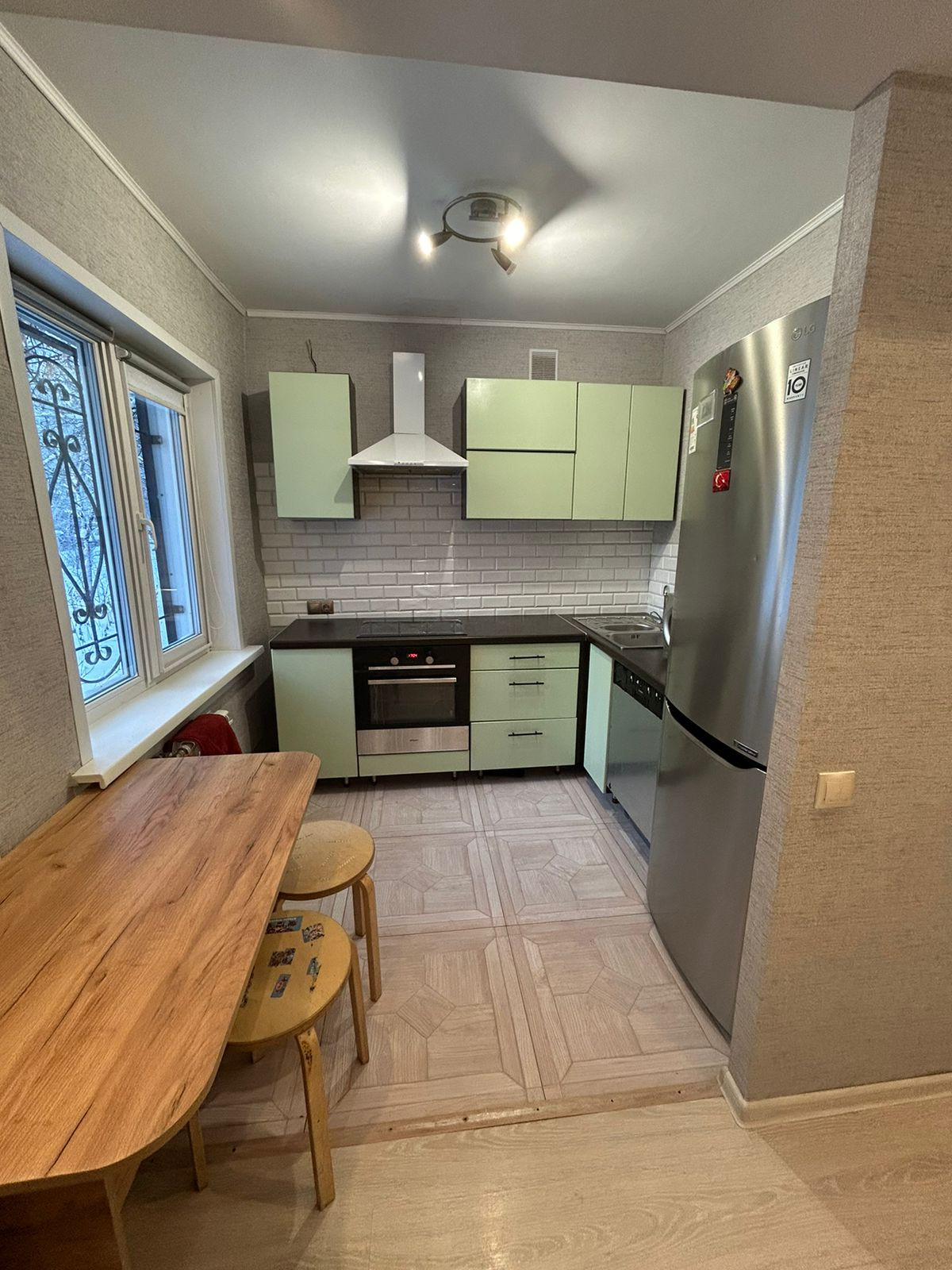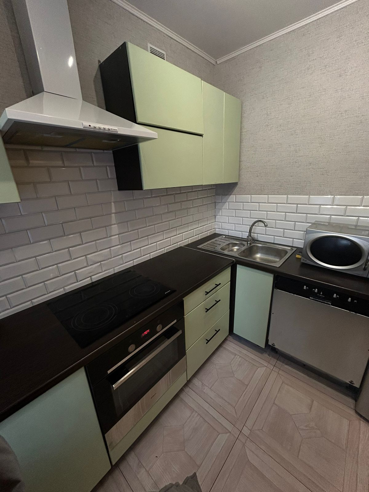 Новым хозяевам остается мебель и техника, а именно: кухонный гарнитур с навесными шкафами, встроенная варочная поверхность, духовой шкаф, холодильник, посудомоечная машина.