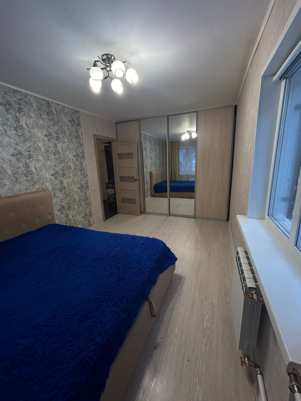 В спальне: двуспальная кровать с подъёмным механизмом и большой встроенный шкаф.