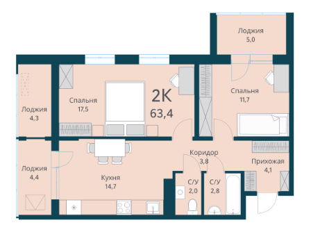 Общая площадь 63.4 м2